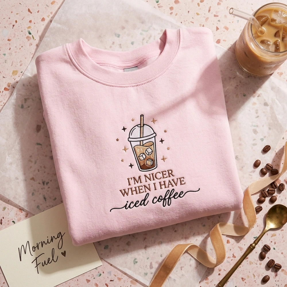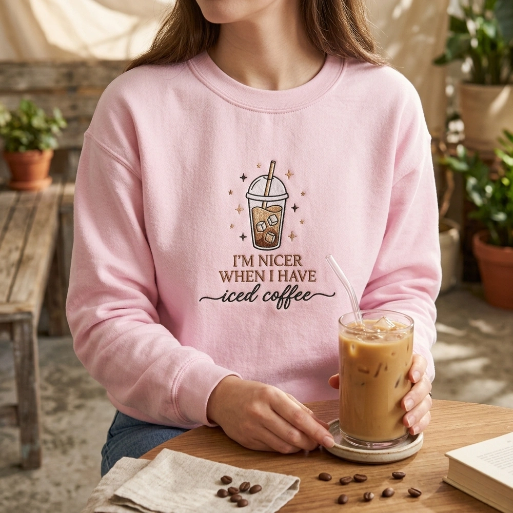 Whether you’re making your morning cafe run or lounging at home, this relatable statement piece speaks your truth: “I’m nicer when I have iced coffee.” Designed for true caffeine enthusiasts, this high-quality custom embroidered crewneck blends everyday comfort with a fun, caffeinated personality. It is the ultimate cozy apparel staple for anyone whose day doesn’t start until that first sip over ice, making it an unforgettable gift for the iced coffee lover in your life.