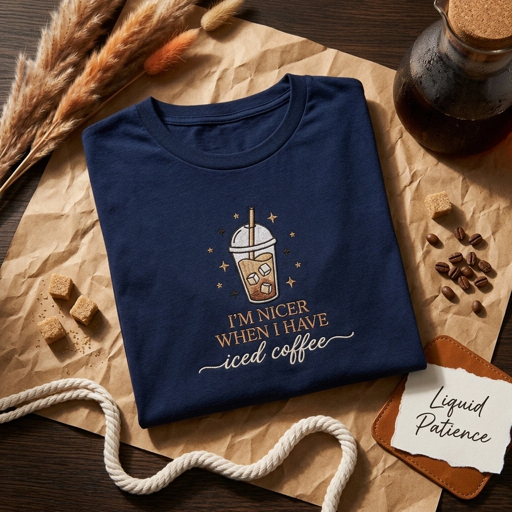 This vibrant embroidery spans approximately 15cm across the chest, featuring a stylized iced coffee cup complete with an orange-peach lid, a matching striped straw, and white ice cubes floating in light brown coffee. The cup is outlined in crisp black satin thread for sharp definition. Beside the cup, the humorous phrase “I’M NICER WHEN I HAVE iced coffee” is stitched using a clean white sans-serif block font paired with a flowing white cursive script. Four small white embroidered stars surround the design, adding a whimsical touch. Crafted using 4 premium thread colors, the design utilizes a mix of dense fill stitches for the liquid and lid, and raised satin stitches for the text and outlines, ensuring a tactile, high-quality finish.