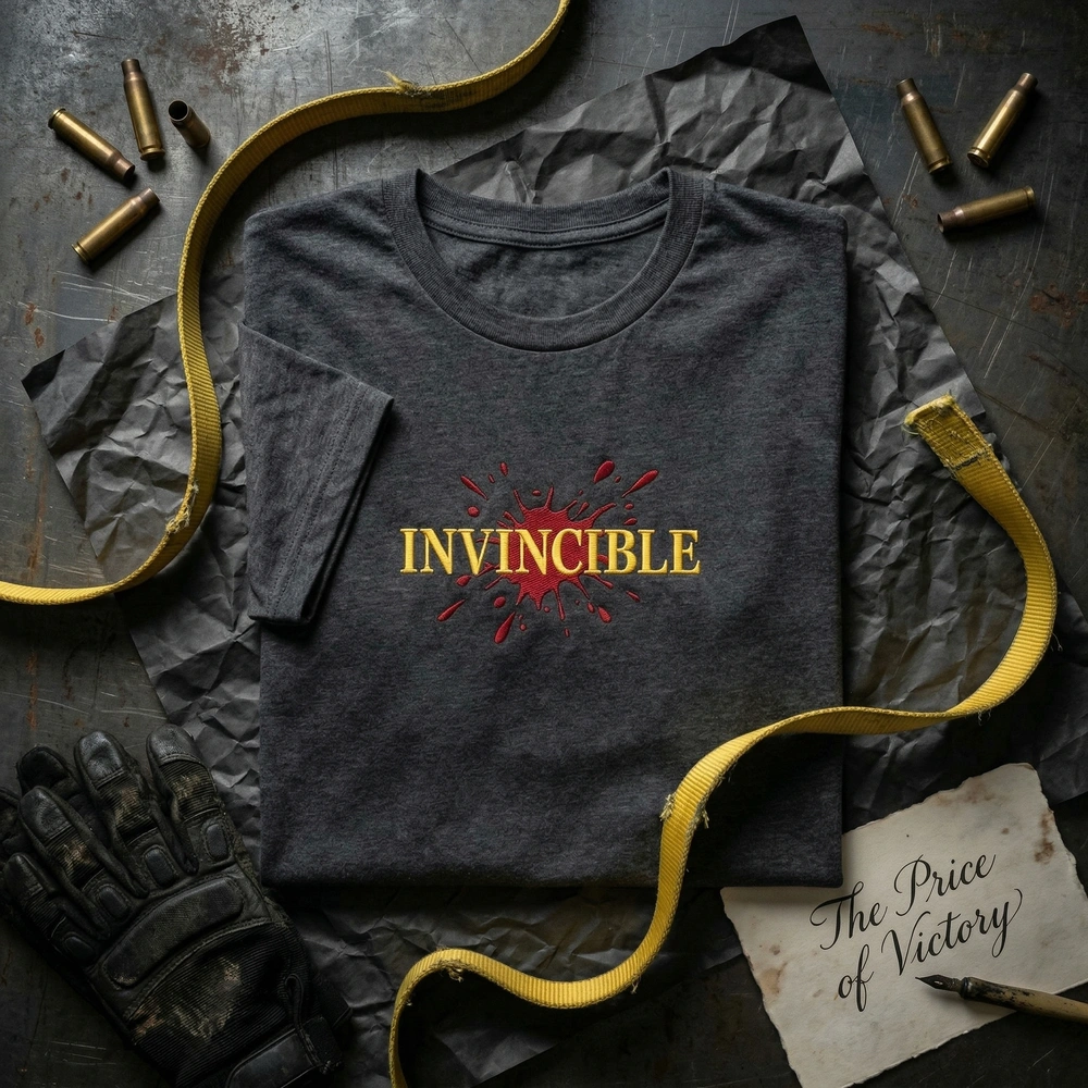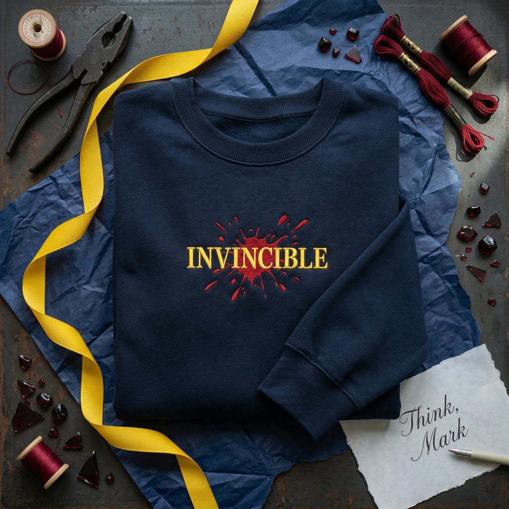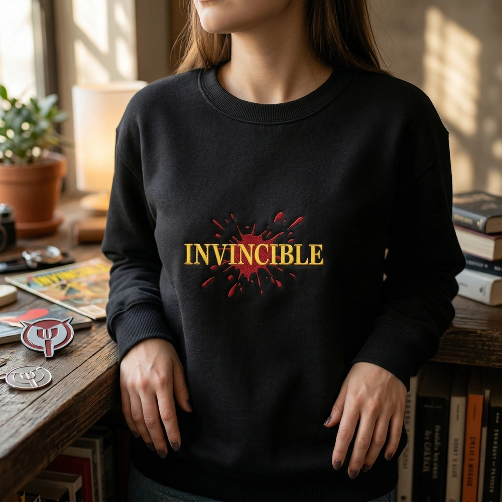 Our “Bloody Title Card V1” design is a masterpiece of modern embroidery digitization. The word ‘INVINCIBLE’ is rendered in massive, bold yellow geometric letters using #FFD700 Hero Yellow thread. This clean base is then aggressively interrupted by heavy, dark crimson red (#8B0000) ‘splatter’ embroidery. We use a high stitch count to ensure the red threads overlap the yellow text densely, mimicking the thick, wet blood buildup seen in the show’s later seasons. The design measures approximately 25cm x 6cm, placed perfectly across the chest for maximum visual impact.