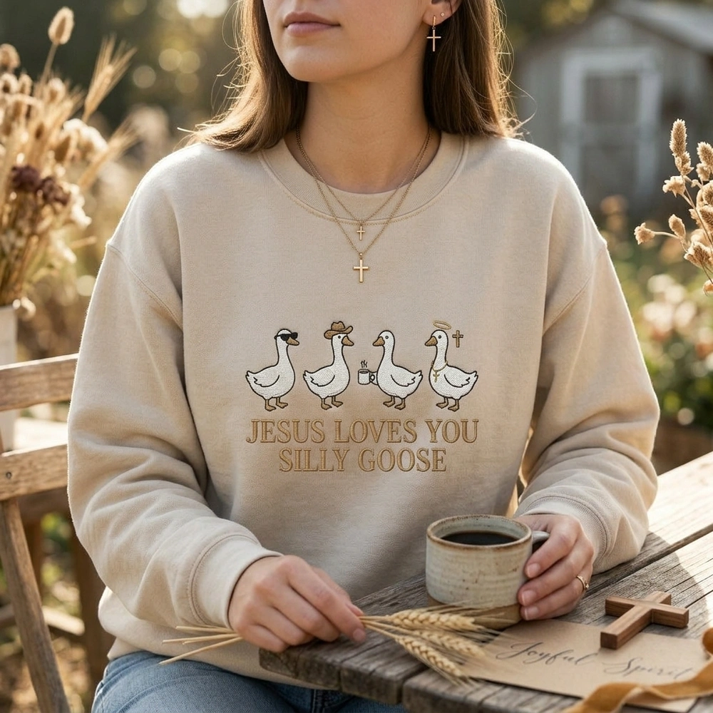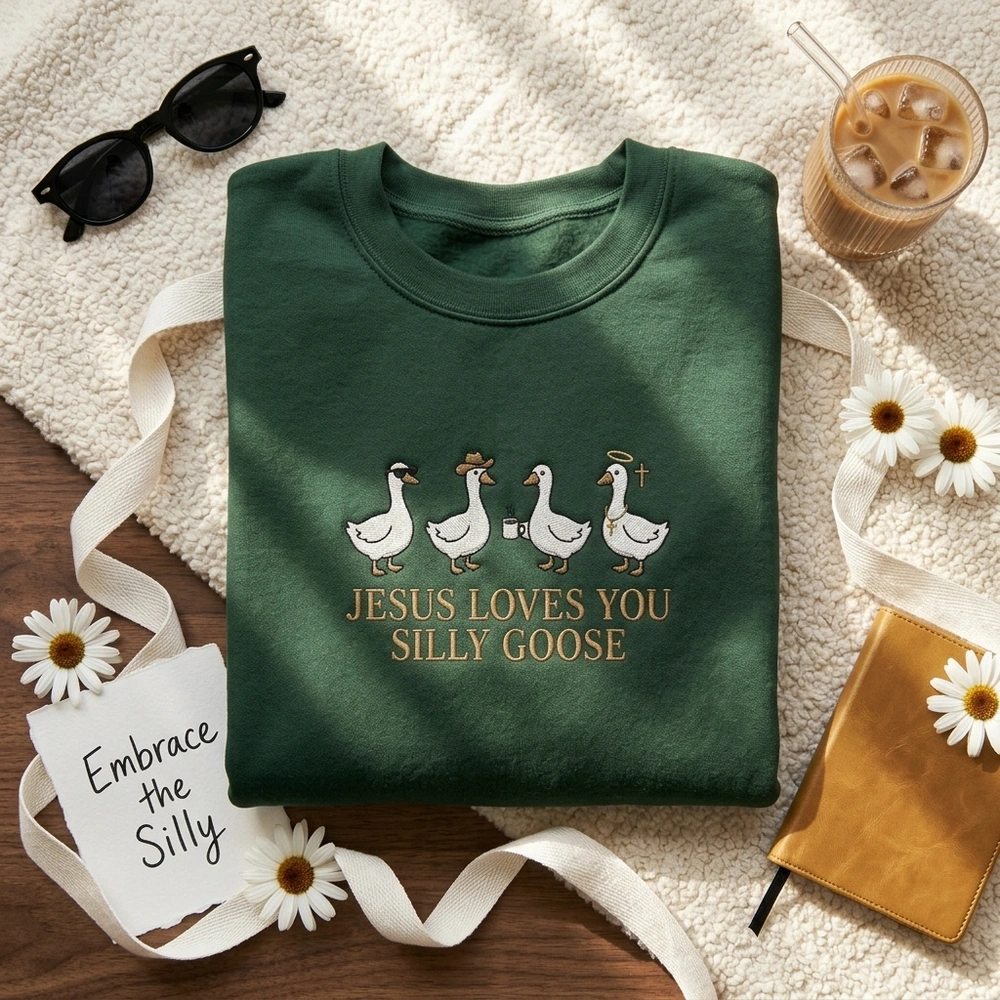 Combining the beloved “Silly Goose” internet culture with a heartfelt faith-based message, this sweatshirt is designed for those who love to share their beliefs with a touch of humor. Whether you are heading to a youth group meeting or just hanging out with friends, this piece serves as a modern conversation starter. Explore more embroidered sweatshirts and christian sweatshirts in our exclusive collection.