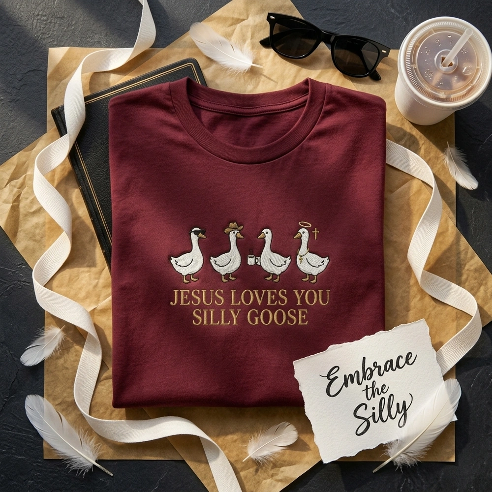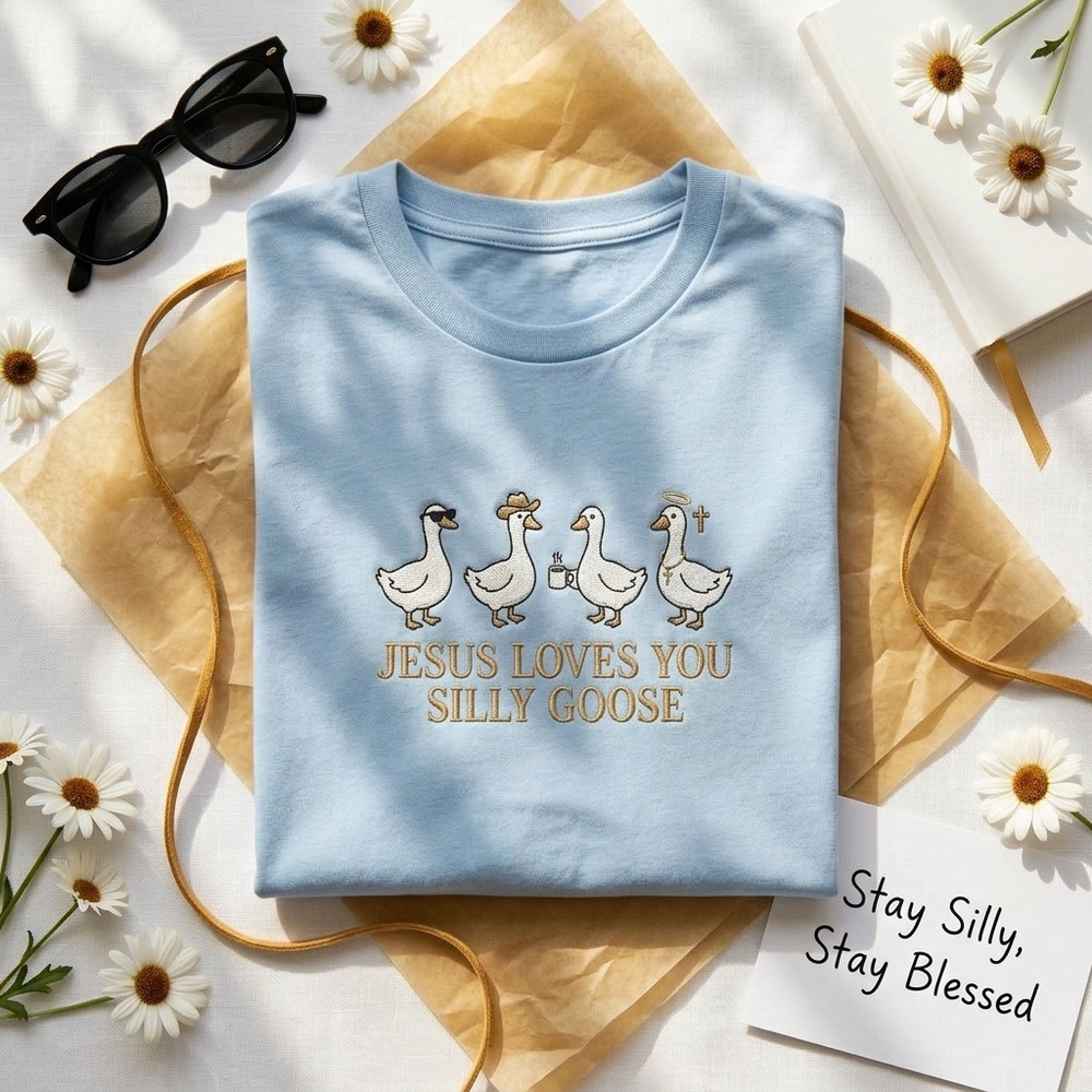 This design blends the popular “Silly Goose” internet meme—often used to describe someone lighthearted and playful—with the timeless Christian message that Jesus loves everyone. It’s a way to make religious apparel feel modern, approachable, and fun.