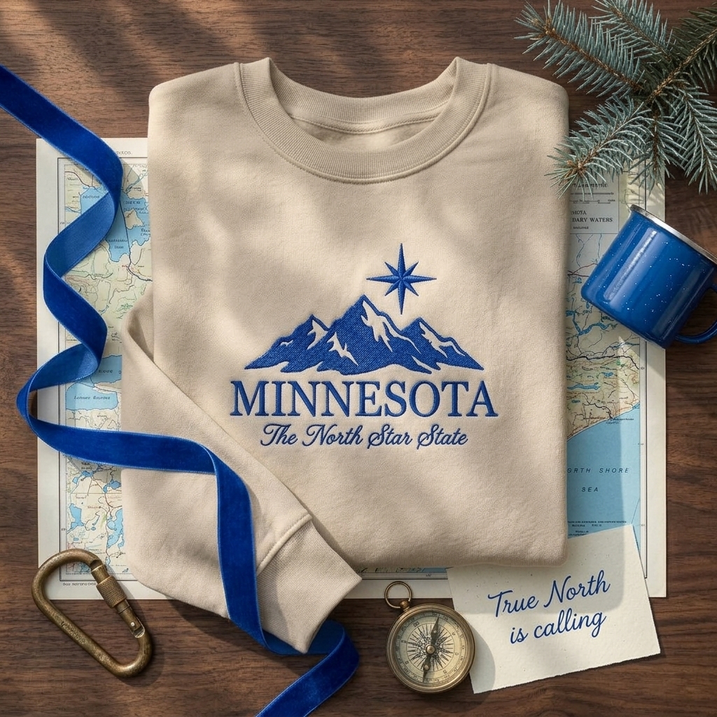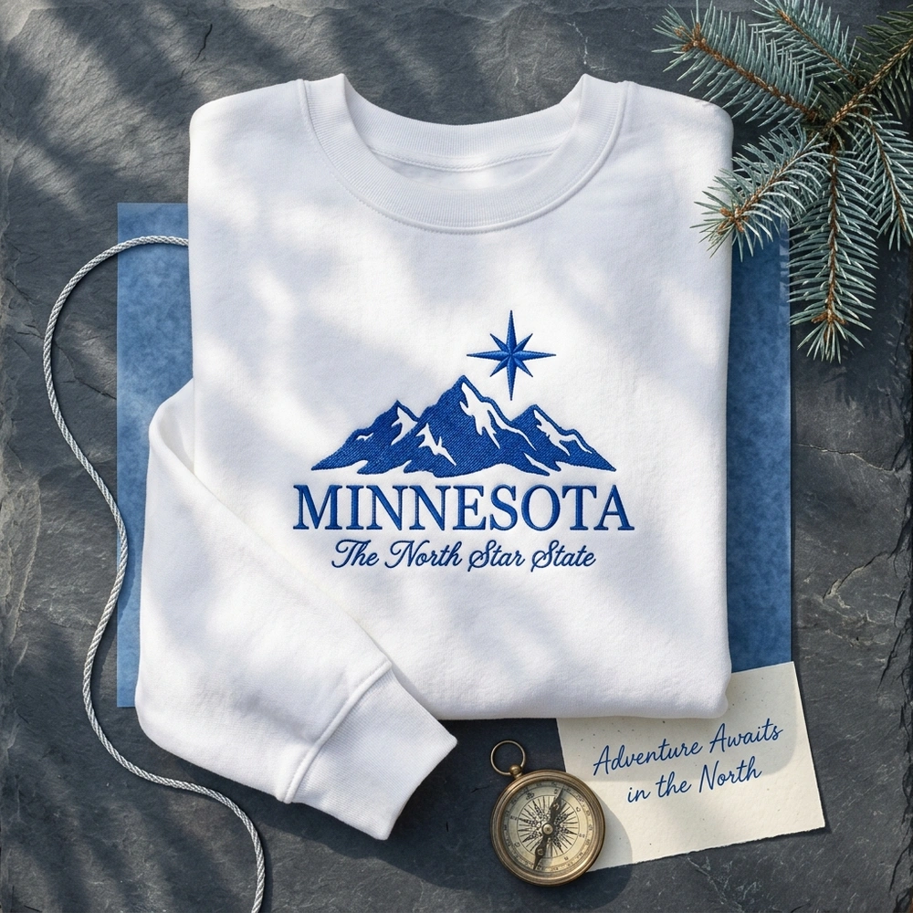 The Lollidollyart Minnesota North Star State Mountain Embroidered Sweatshirt is a premium handcrafted crewneck featuring a rugged mountain landscape. This high-quality garment is designed for those who carry the spirit of the North with them, whether hiking the North Shore or relaxing at home. Made for Minnesota residents and outdoor enthusiasts alike, this piece combines classic state pride with a sophisticated, monochromatic aesthetic that far outlasts standard screen-printed apparel.