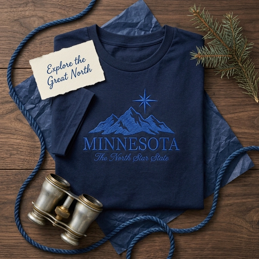 This design features a 10cm x 7.5cm embroidery area centered on the chest. The artwork showcases a jagged mountain silhouette rendered in a dense blue fill stitch for maximum durability and texture. Above the peaks sits a prominent eight-pointed North Star in a smooth satin stitch, complemented by delicate accent stars. The word ‘MINNESOTA’ is anchored in a bold serif font, while the ‘The North Star State’ motto is finished in an elegant flowing script. We use a single shade of Royal Blue (#3B63D1) thread to ensure a cohesive, timeless appearance.