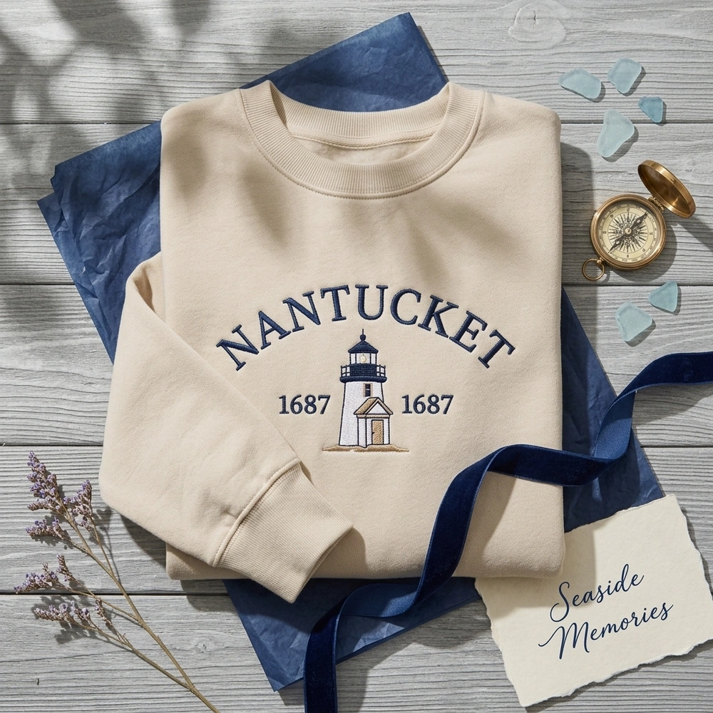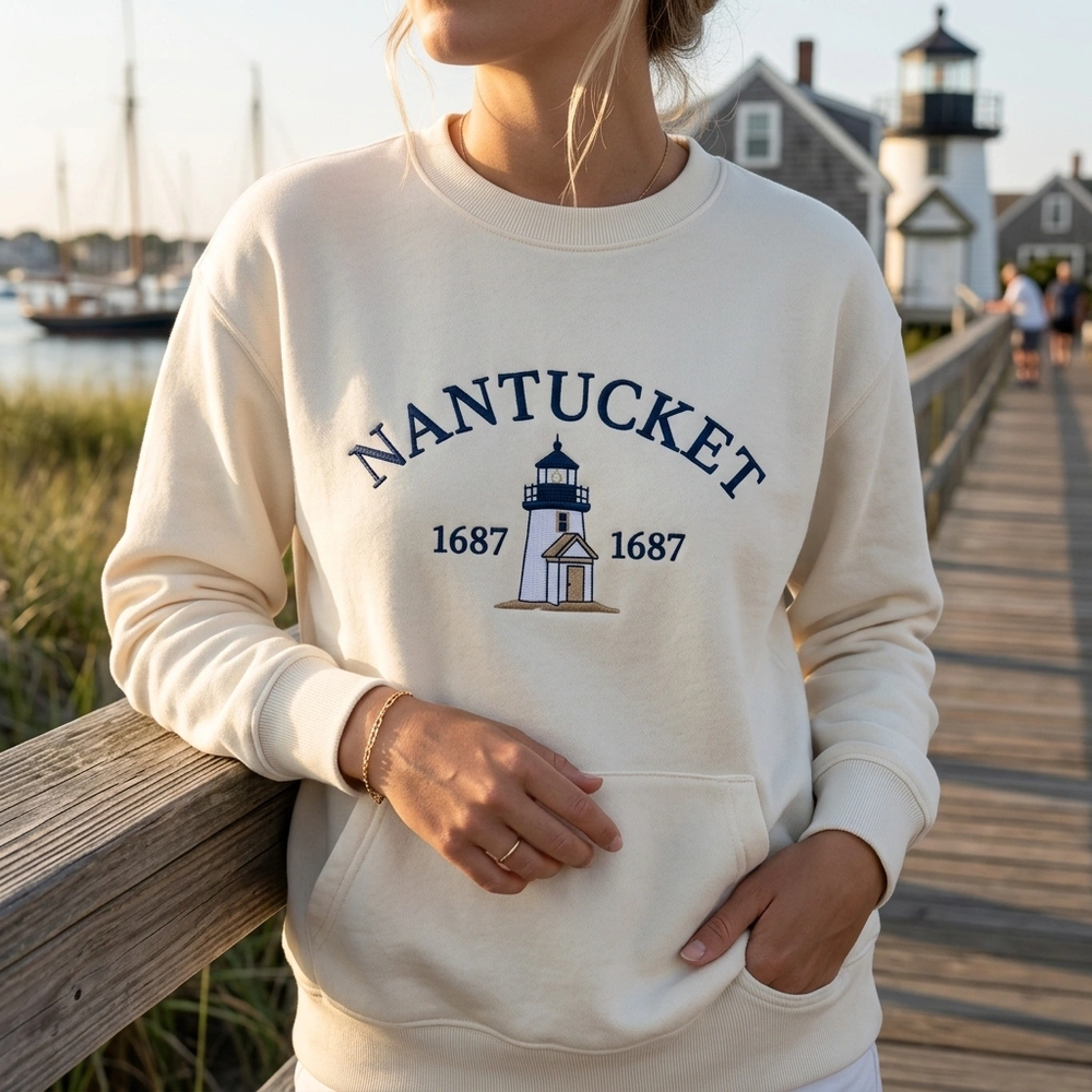 The Nantucket Lighthouse Embroidered Sweatshirt is a premium machine-embroidered crewneck featuring a classic coastal design—perfect as a personalized gift.