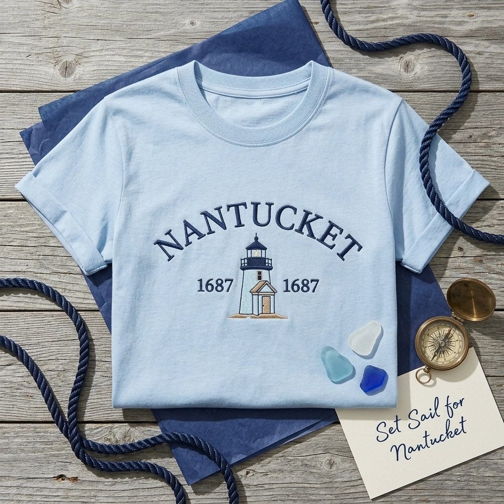 Our Nantucket Coastal Heritage design is a masterpiece of technical embroidery. It features “NANTUCKET” in a bold, arched serif font using a dense navy blue satin stitch for a luxurious, raised effect. At the center lies an intricate oval-framed landscape of a traditional lighthouse, utilizing over 5 thread colors (Navy, Light Blue, White, Black, and Tan). The sky and sea are rendered with horizontal light blue fill stitches to create depth, while the lighthouse itself features fine running stitches for architectural detail. Flanking the graphic is the “1687” establishment date, finished with “Massachusetts” in an elegant, smaller script. The entire design measures approximately 12cm x 10cm, perfectly placed for a classic look.