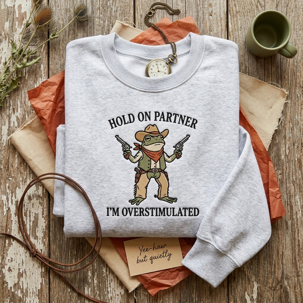 This exclusive design features a high-density 18cm x 16cm embroidery on a premium Light Heather Grey garment. The composition showcases an anthropomorphic frog in a classic Western standoff, complete with a dark brown cowboy hat, rust-orange duster jacket, and dual revolvers. We use 6 high-quality thread colors—including Olive Green, Rust Orange, and Dark Brown—utilizing a mix of satin stitching for the bold serif typography and tatami fill for the illustrative, comic-book-style character. The “Hold On Partner, I’m Overstimulated” text is rendered in thick black linework for maximum impact.
