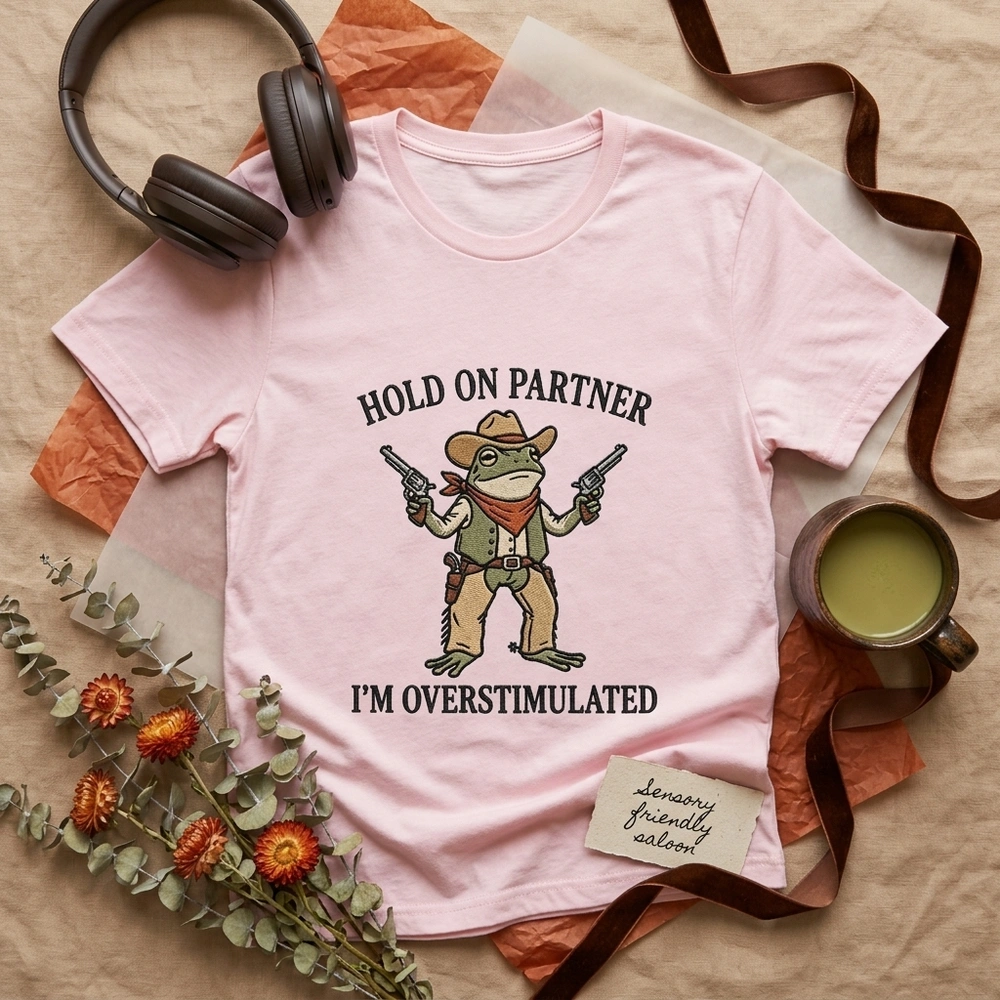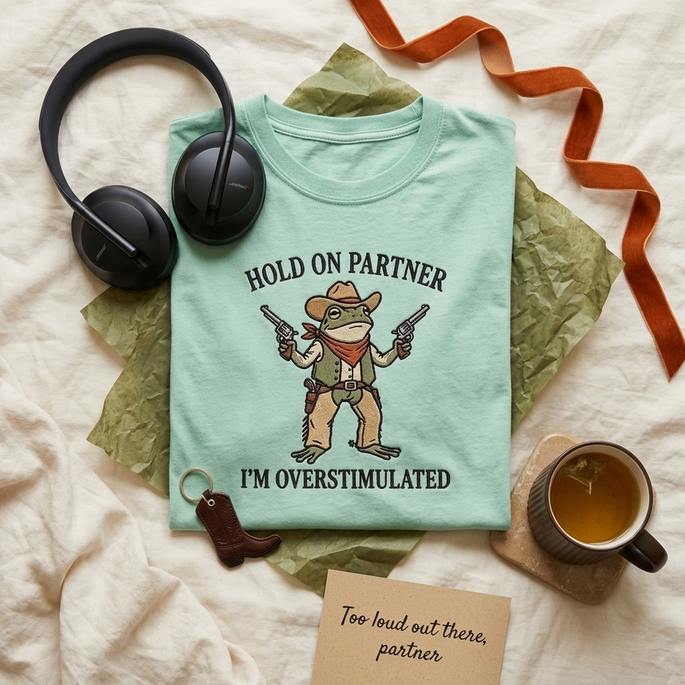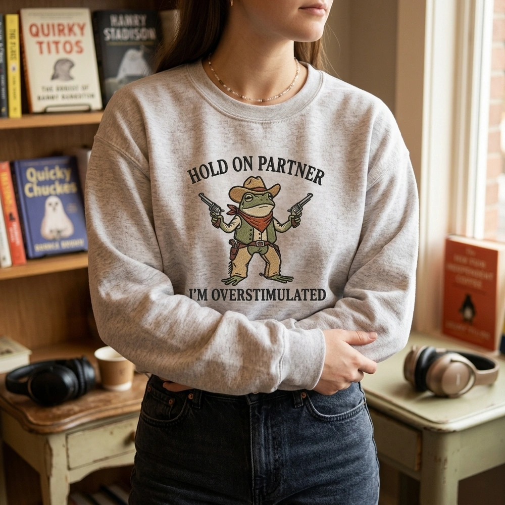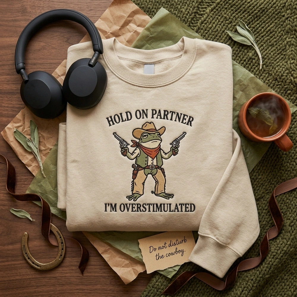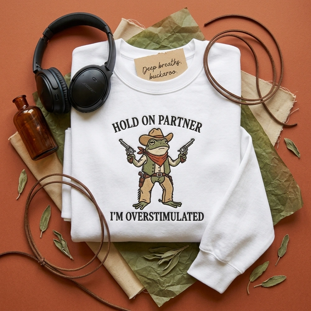 Combining the absurdly popular “frogcore” aesthetic with a deeply relatable sentiment about sensory overload, this sweatshirt is designed for the neurodivergent community and meme culture fans alike. Whether you’re navigating ADHD, autism, or just the general chaos of modern life, this cowboy frog understands the struggle. Browse more embroidered sweatshirts | funny sweatshirt designs in our collection to find your perfect match.