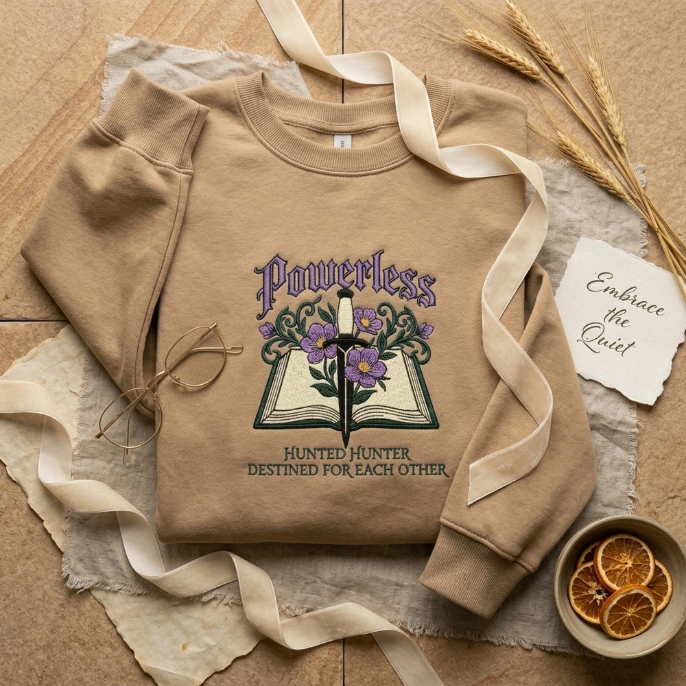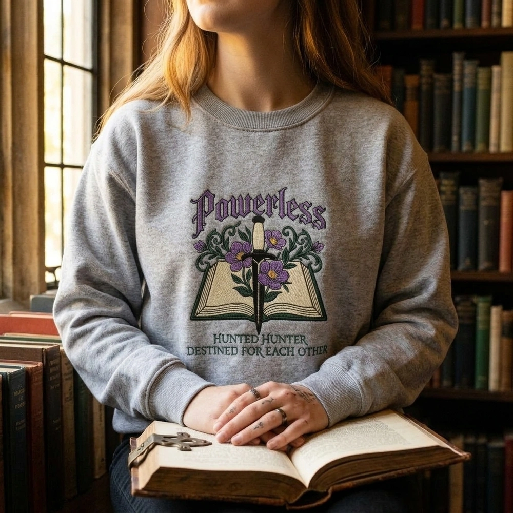 The Lollidollyart Powerless Fantasy Romance Embroidered Sweatshirt is a premium bookish crewneck featuring an intricate gothic dagger and book design. This handcrafted piece is essential for fans of the ‘Powerless’ and ‘Reckless’ series who want high-quality, wearable art that celebrates their favorite literary world.
