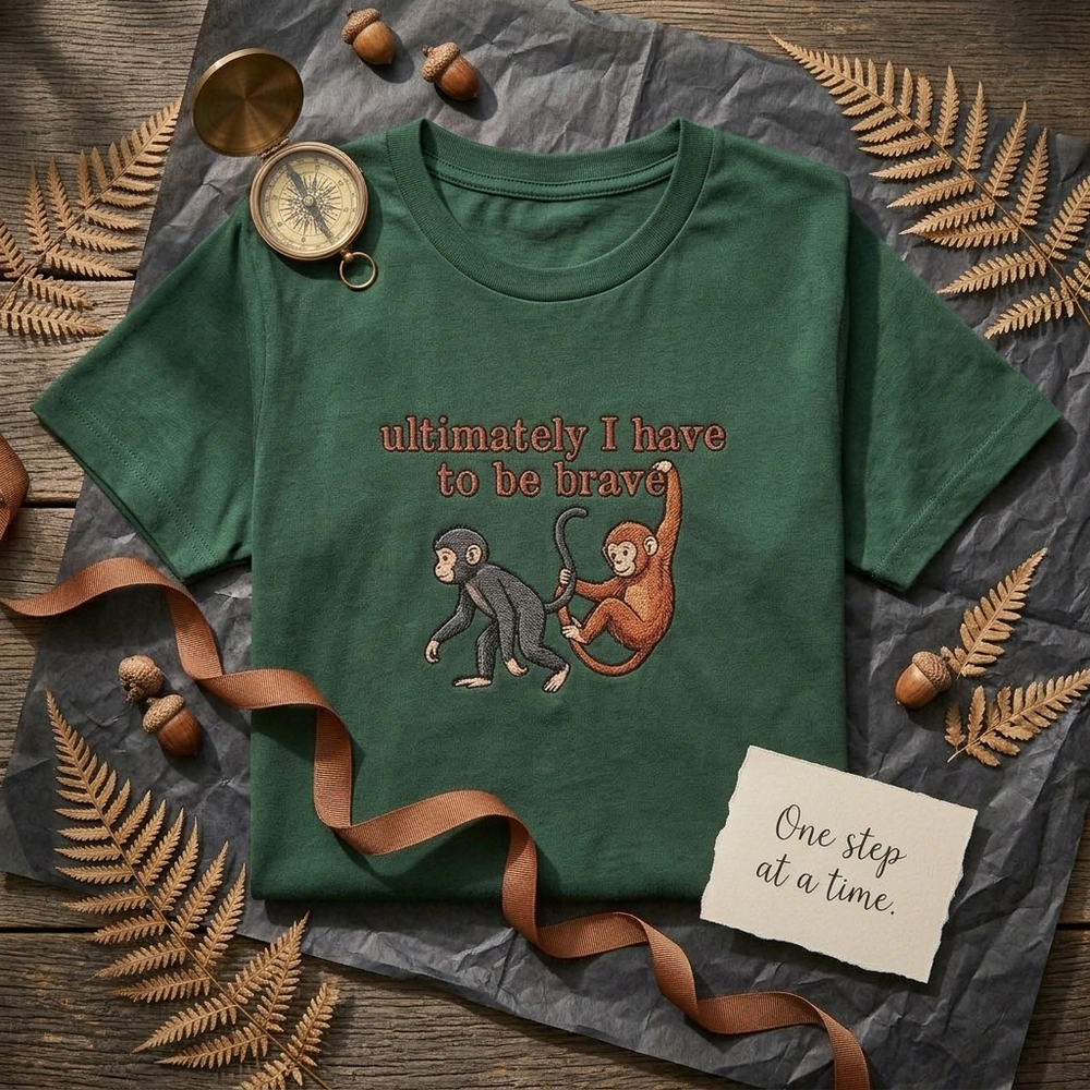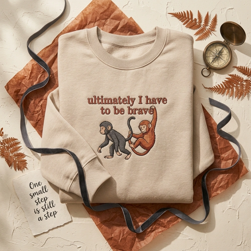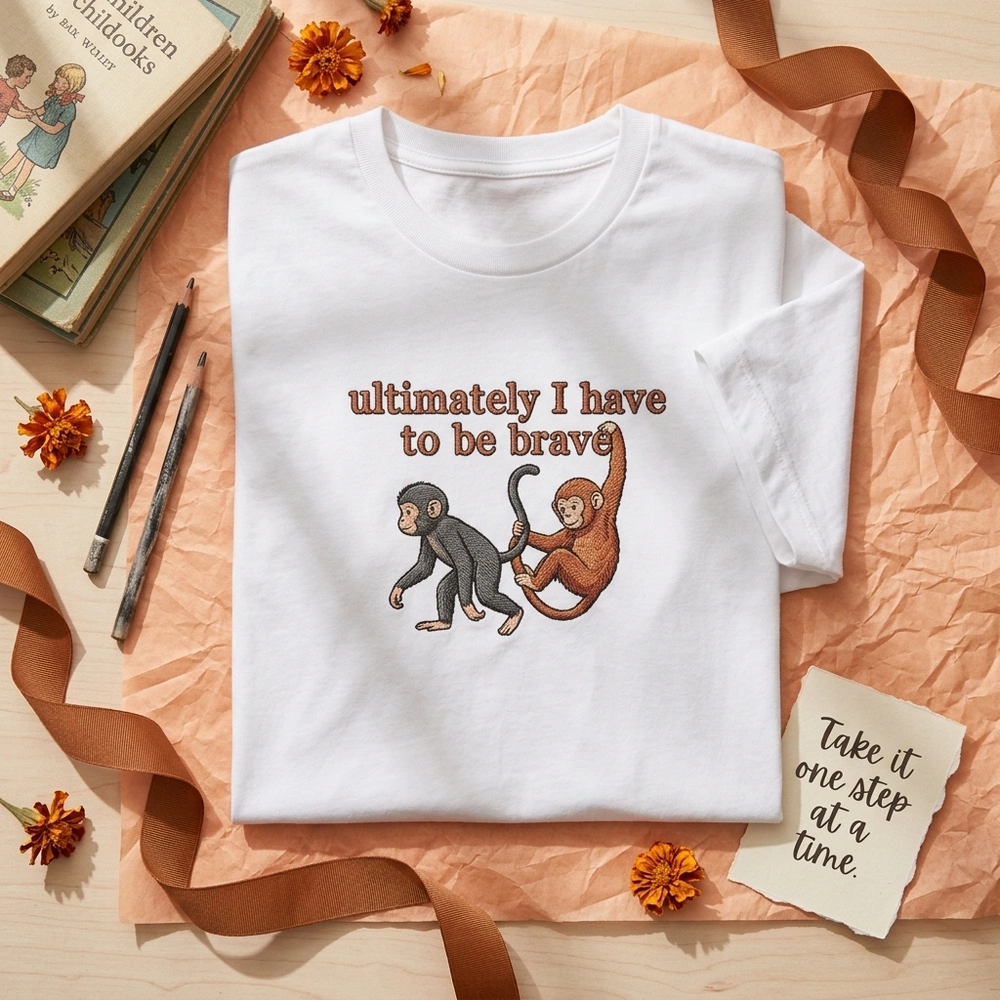 This exclusive design is meticulously rendered on a premium Grey garment using a rich palette of five thread colors: Terracotta Red, Black, Charcoal Grey, Tan, and Rust Orange. The embroidery measures approximately 18cm x 15cm and features a smaller, stoic charcoal monkey dragging a larger, rust-orange monkey who is clinging desperately to its leg. The text ‘ultimately I have to be brave’ is executed in a vibrant terracotta red satin stitch with thin black running stitch outlines for a hand-drawn feel. Dense fill stitches create a tactile, fur-like texture, while fine black linework provides the expressive facial details reminiscent of classic children’s literature illustration.