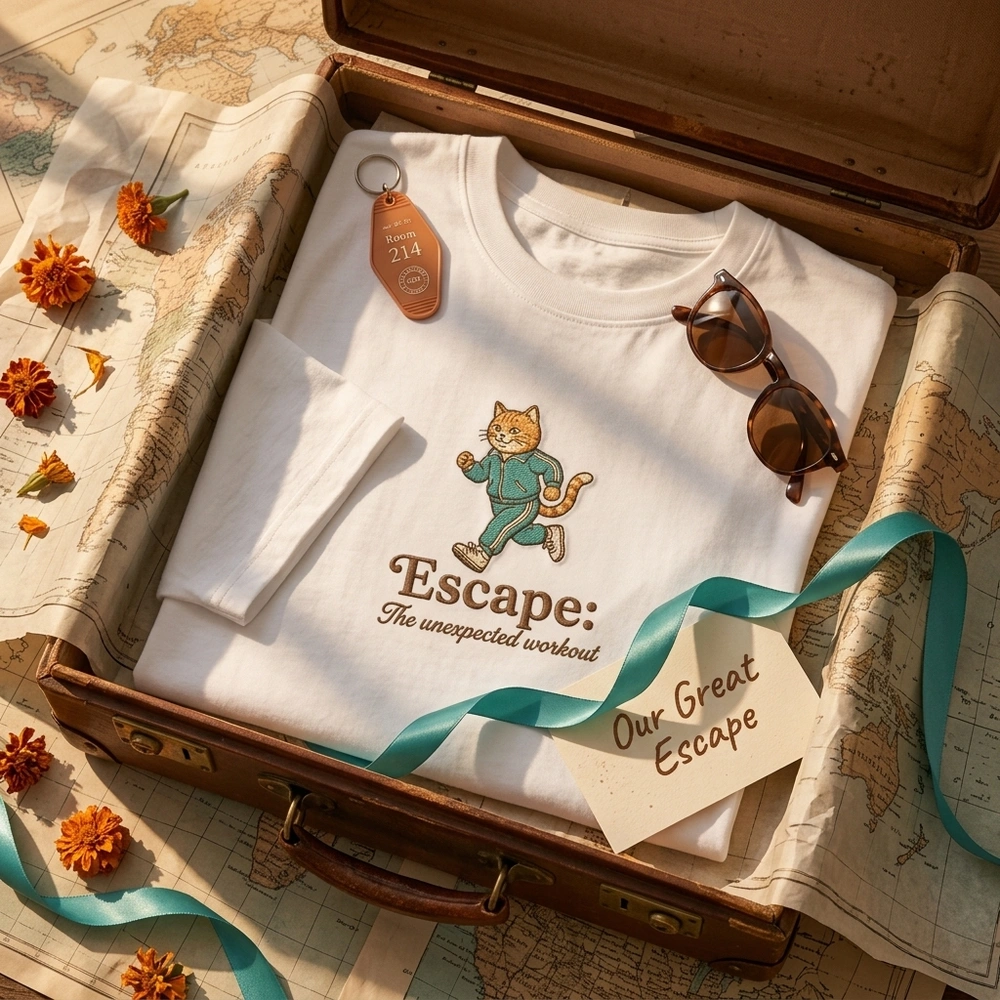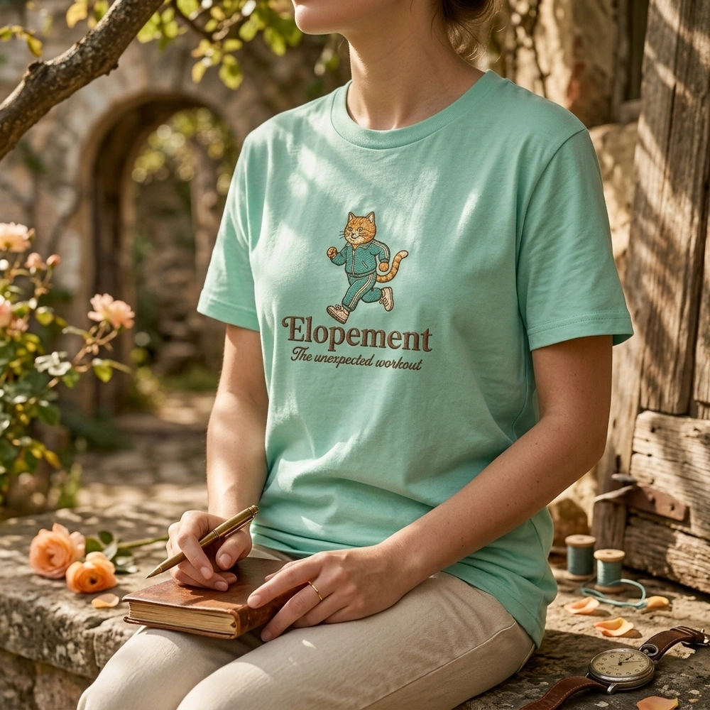 This design is expertly crafted on a Mint Green garment, providing a fresh and vintage-inspired backdrop for the vibrant embroidery. The centerpiece is a 25cm x 22cm high-density design featuring an orange tabby cat in mid-stride, complete with a teal tracksuit, headband, and white sneakers. The 4-color palette—Distressed Brown, Muted Orange, Retro Teal, and Off-White—is stitched with precision to mimic a vintage screen-printed look. The arched ‘ELOPEMENT’ text and ‘THE UNEXPECTED WORKOUT’ tagline are rendered in bold, durable thread, ensuring this statement piece lasts for years of anniversaries.
