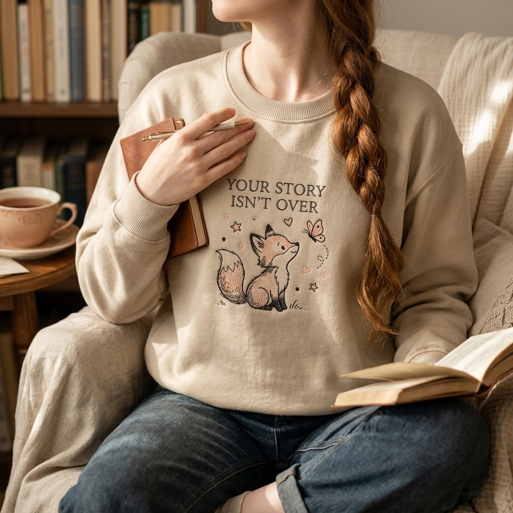The Lollidollyart Second Chance Fox Literary Embroidered Sweatshirt is a premium sand crewneck featuring a whimsical fox and a hopeful bookish quote — perfect as a personalized gift.