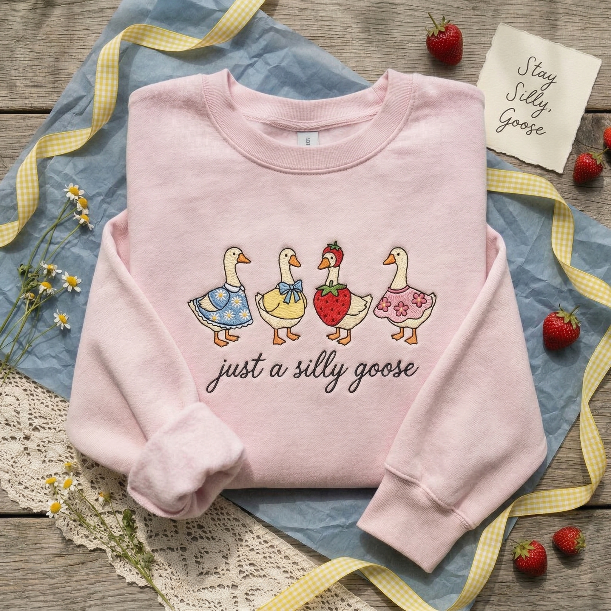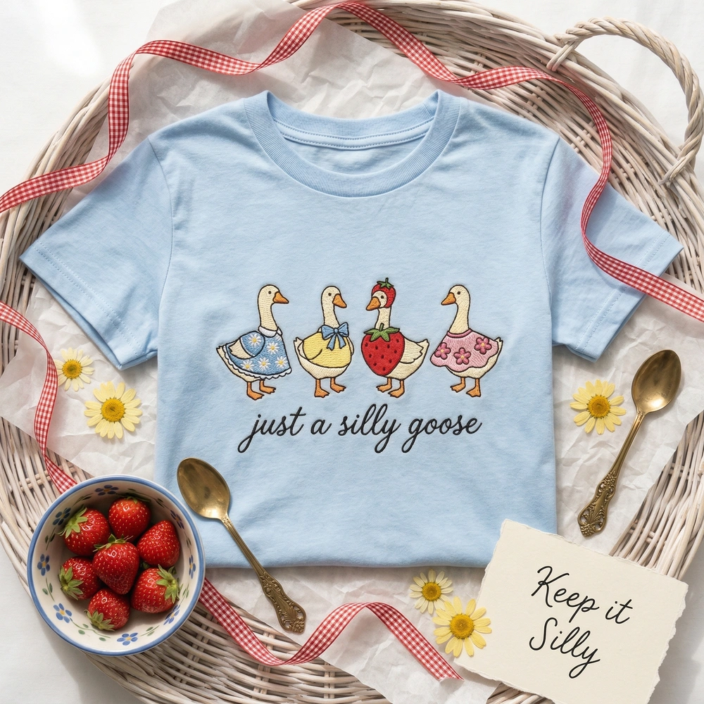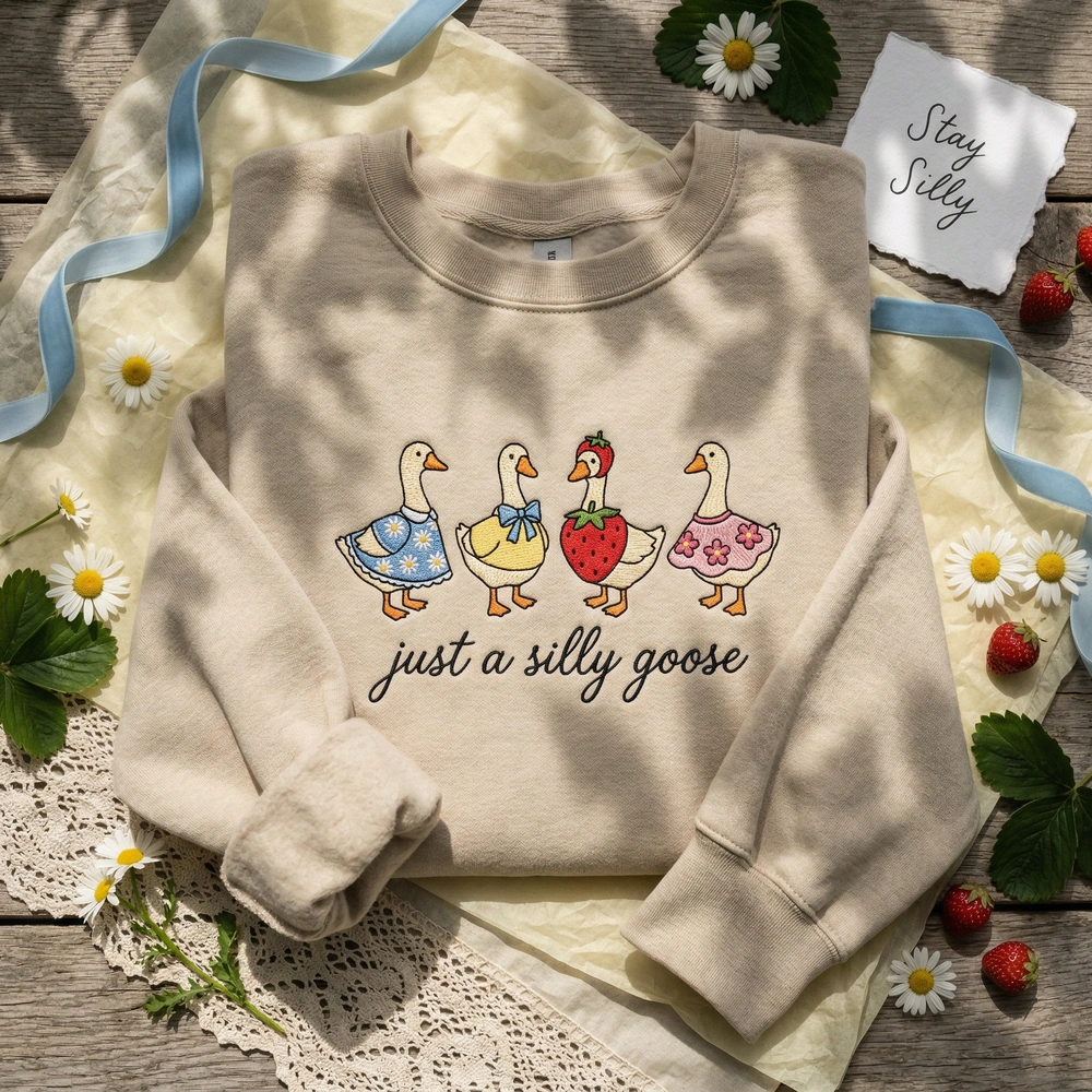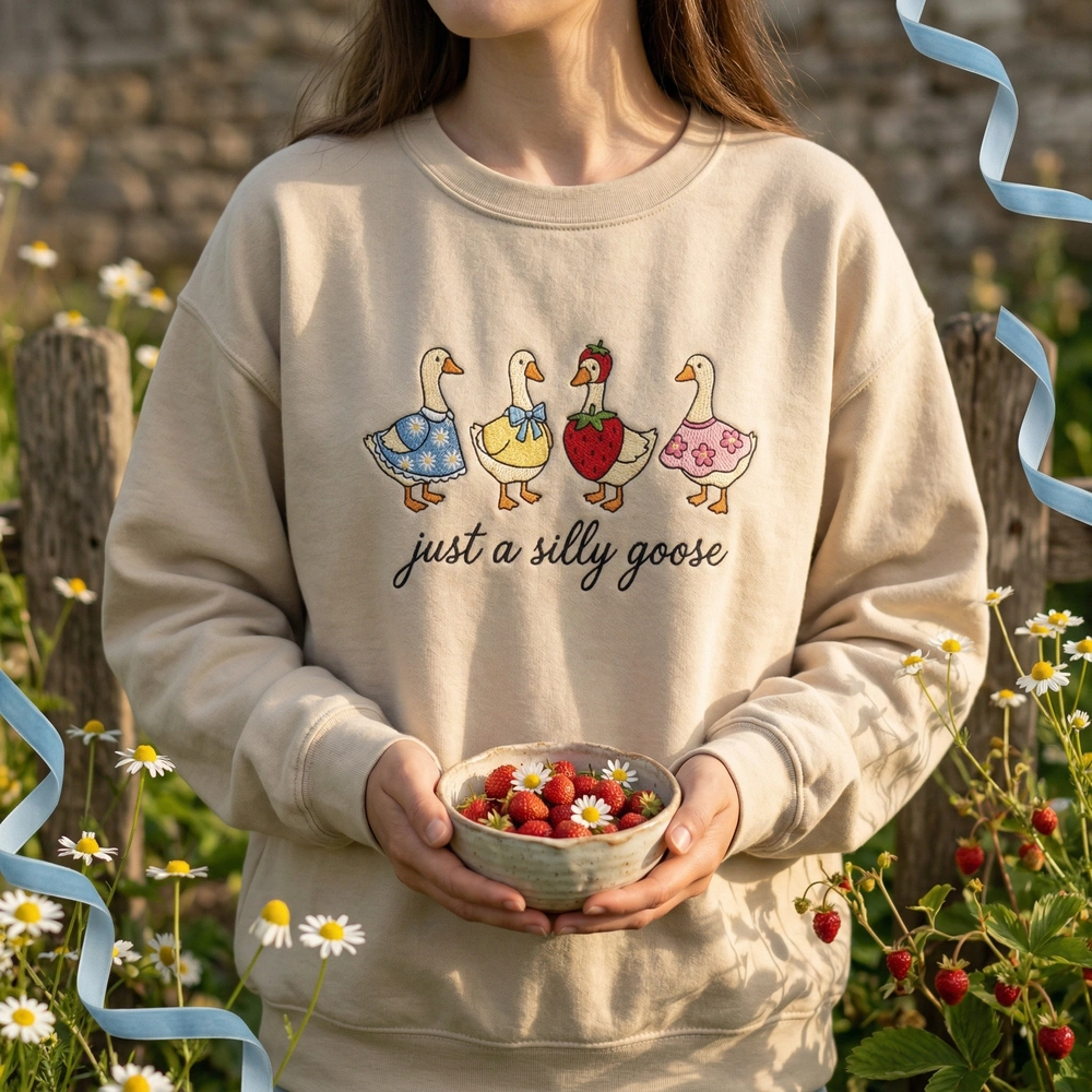The Silly Goose Cottagecore Embroidered Sweatshirt is a premium machine-stitched crewneck featuring four whimsical geese—the ultimate personalized gift.