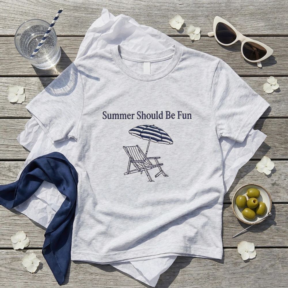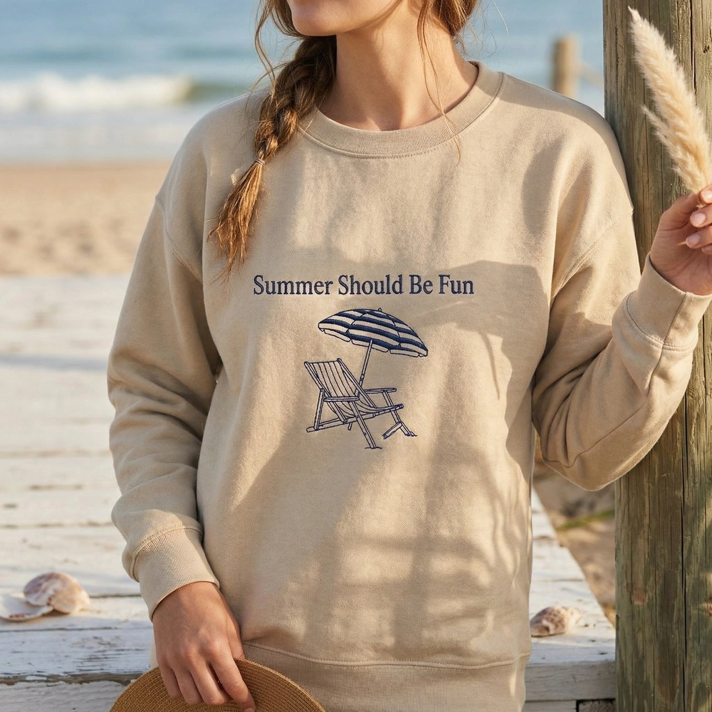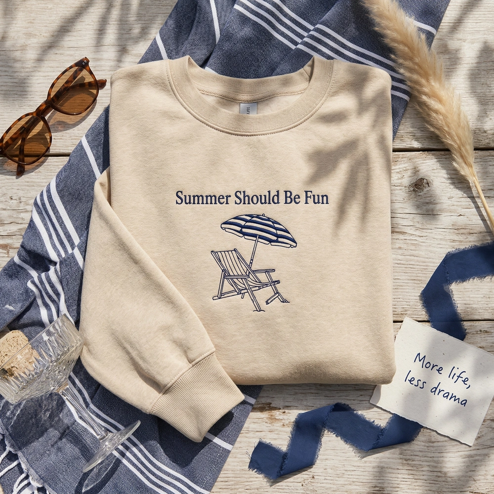 This original design features a minimalist, single-color line art illustration of a classic wooden Hamptons beach chair sitting under a striped umbrella. To capture the hilarious pop culture drama, one of the chair legs is snapped in half, accompanied by the subtle text arc: “Summer Should Be Fun.” The design is rendered in premium #000080 Navy thread, providing a sharp contrast against the neutral Sand garment. Every piece is machine-embroidered with precision, featuring a 15cm x 15cm design area that ensures durability and a professional finish that far outlasts traditional screen prints.