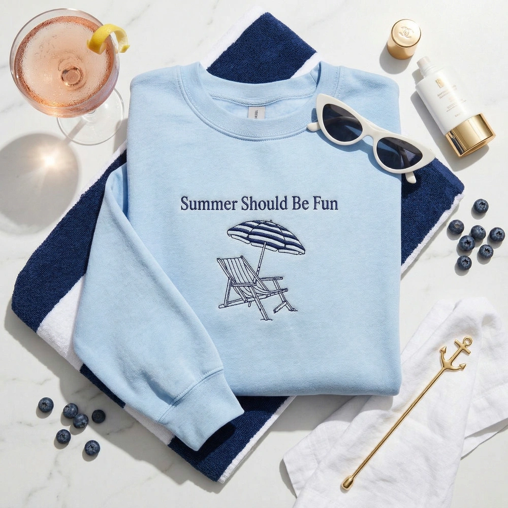 The Summer Should Be Fun Embroidered Sweatshirt features a minimalist beach chair design, capturing the iconic reality TV quote for any Hamptons fan.
