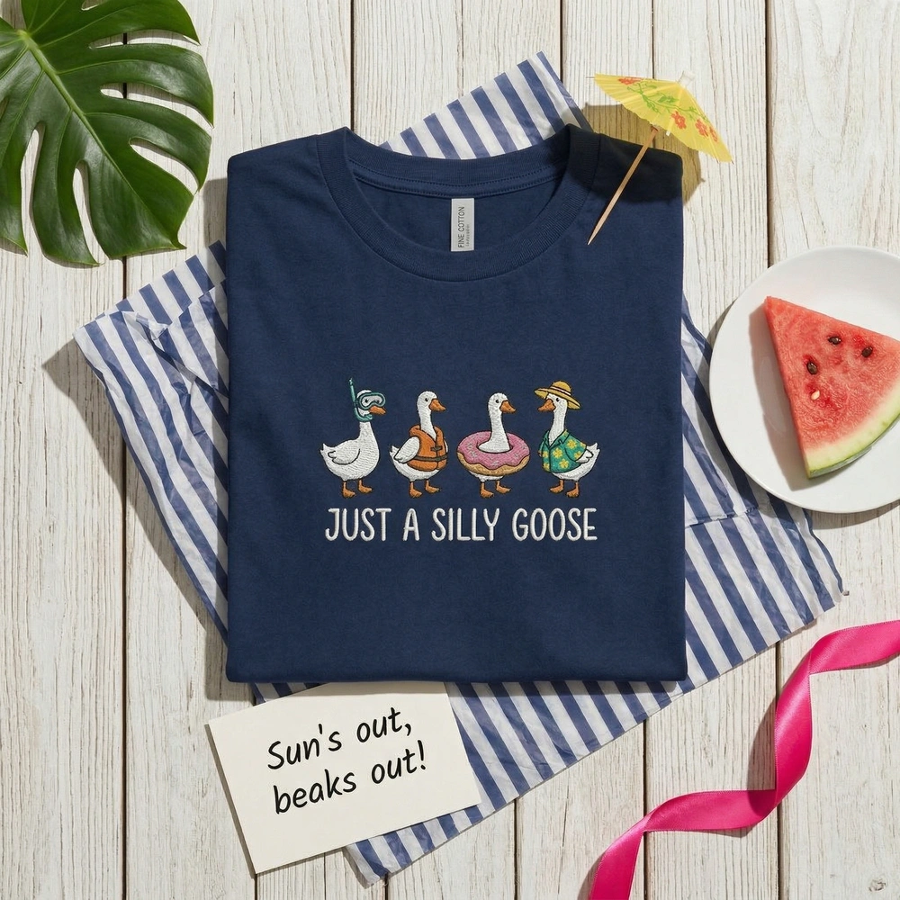 This intricate design features four distinct goose characters, each with their own personality. The 18cm x 10cm embroidery utilizes a rich 8-color thread palette including Royal Blue, Lime Green, Hot Pink, and Golden Yellow. We use a combination of solid fill stitches for the vibrant accessories—like the snorkel mask, floral lei, and watermelon slice—and crisp black running stitches for the cartoon outlines. The casual ‘JUST A SILLY GOOSE’ text is embroidered in a handwritten font at the center chest for maximum impact.