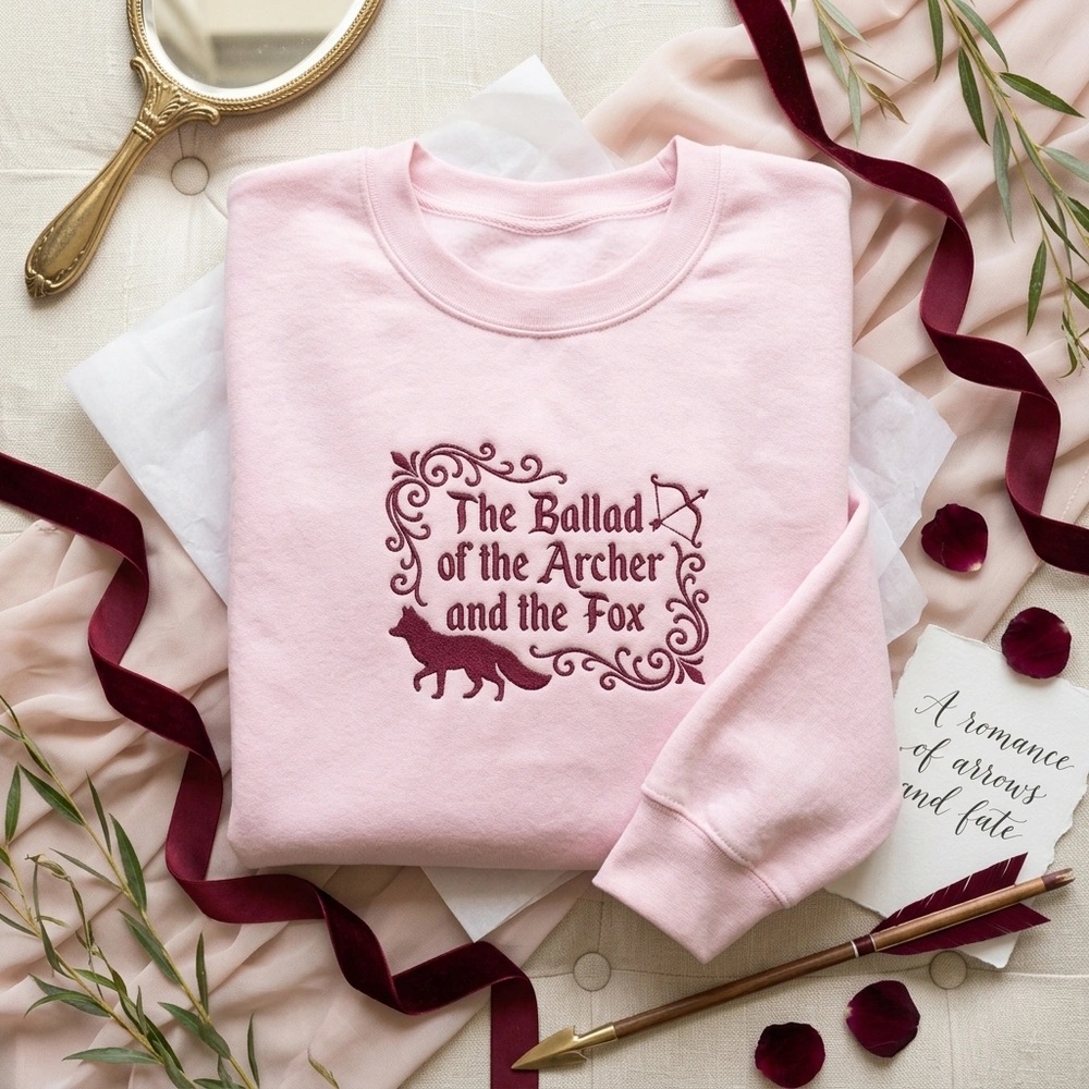 The Ballad of the Archer and the Fox Embroidered Sweatshirt is a premium bookish crewneck featuring custom sleeve personalization for fantasy lovers.