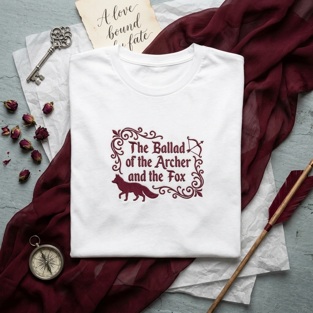 This design features a masterful combination of textures and techniques. The centerpiece is the whimsical, gothic-inspired typography of “The Ballad of the Archer and the Fox,” rendered in precise satin stitches that catch the light. A dense tatami fill stitch brings the fox silhouette to life with a rich, raised texture on the bottom right, while a delicate bow and arrow motif and swirling filigree frame the composition. The entire 16cm x 20cm design is executed in a single, deep burgundy thread (#800020), creating a sophisticated monochromatic contrast against the sand-colored fabric.