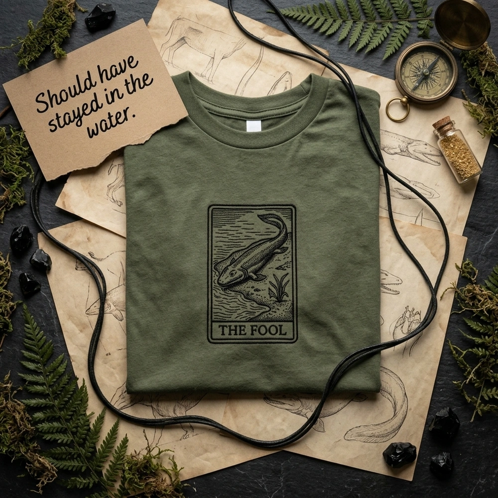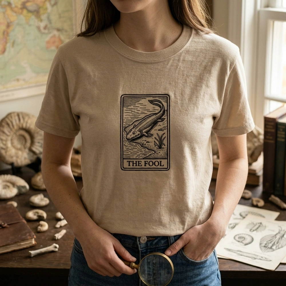 This design is a tribute to the famous Tiktaalik meme, which humorously depicts the prehistoric lobe-finned fish as ‘The Fool’ from the Rider-Waite tarot deck, symbolizing the beginning of a journey—in this case, the evolutionary journey onto land.