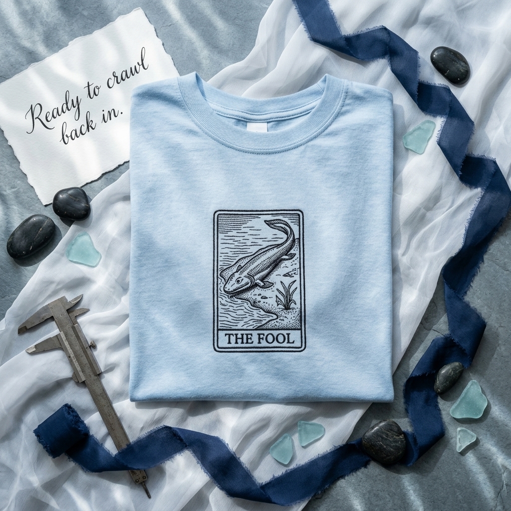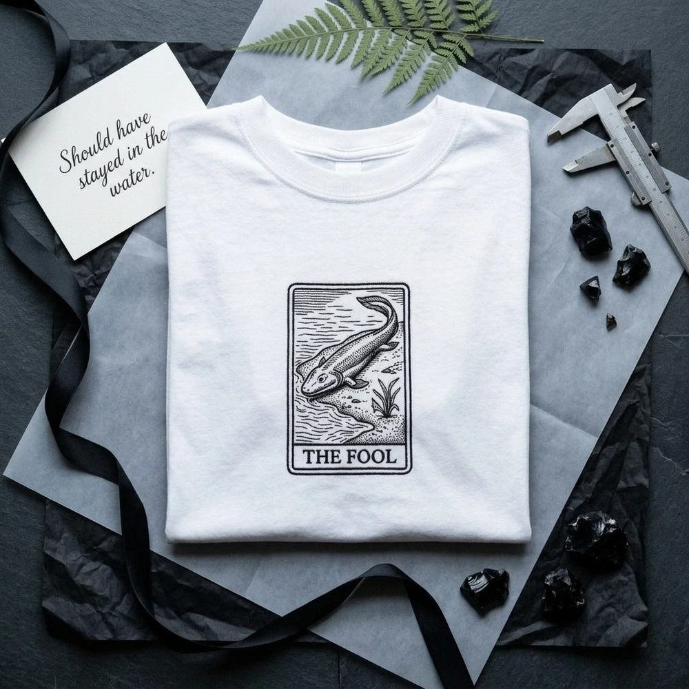 This design features a high-density center-chest embroidery measuring 12cm x 16cm. Using a single-color black thread (#000000), we have captured the intricate woodcut texture of a traditional tarot card. The Tiktaalik is depicted in a classic ‘The Fool’ composition, surrounded by stylized water ripples and marsh grass. The use of dense black satin stitching for the rectangular frame and serif text provides a sharp, high-contrast look against the neutral sand-colored garment. The tactile finish is achieved through varying running stitch densities, ensuring the prehistoric details stand out.