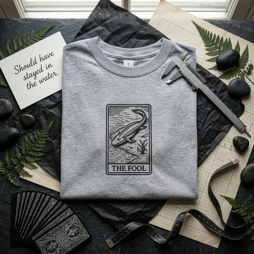 The Tiktaalik Embroidered Sweatshirt features a clever ‘The Fool’ tarot card design, merging prehistoric science with iconic evolution humor memes.