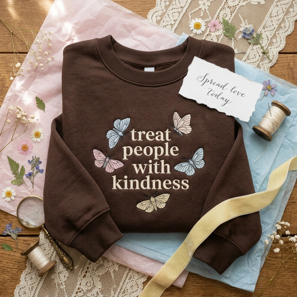 The Treat People With Kindness Embroidered Sweatshirt is a premium machine-embroidered top featuring a whimsical moth design on chocolate brown fabric.