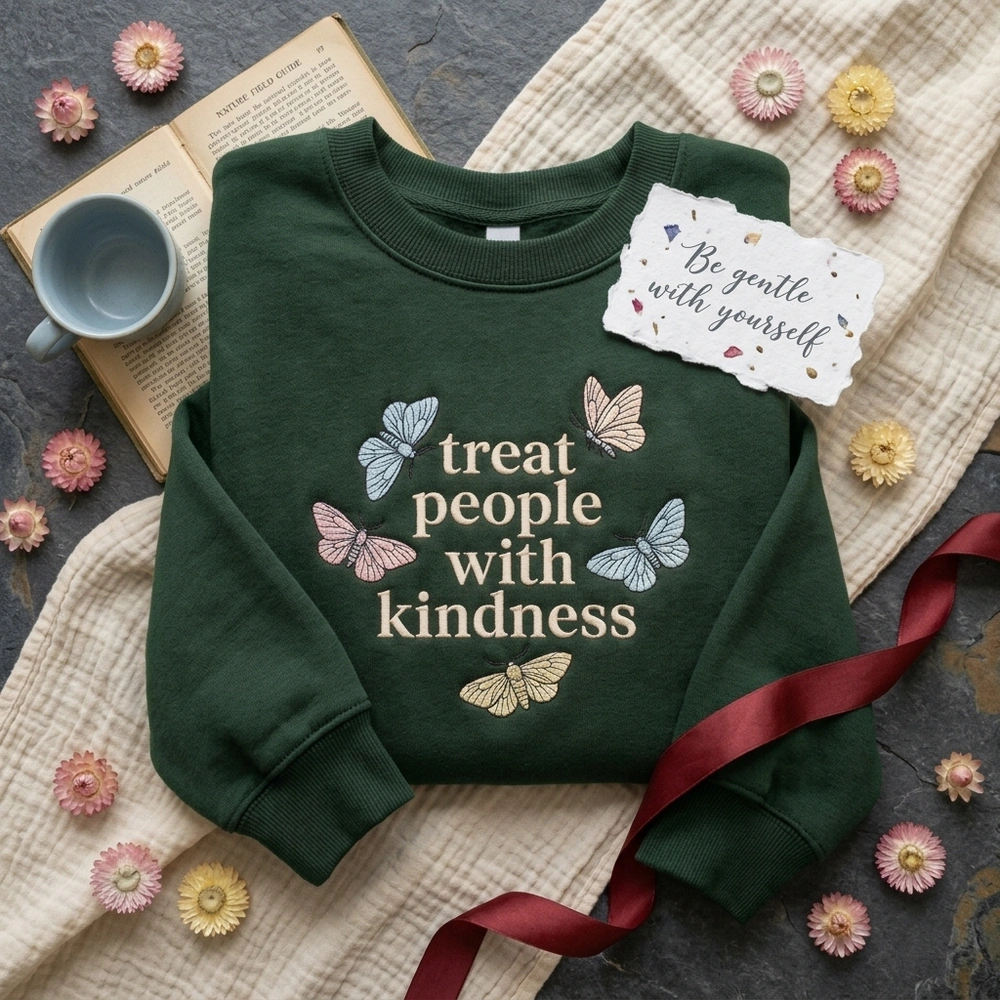 This soft, chocolate brown sweatshirt offers a cozy, wearable reminder to spread positivity and grace. Designed for those who find beauty in the natural world and strength in gentle words, it blends a beloved lyrical mantra with a vintage-inspired aesthetic. Whether you are heading to a concert or enjoying a quiet morning in the garden, this piece connects you to a community of kindness. Browse more embroidered sweatshirts | cottagecore sweatshirt in our collection.