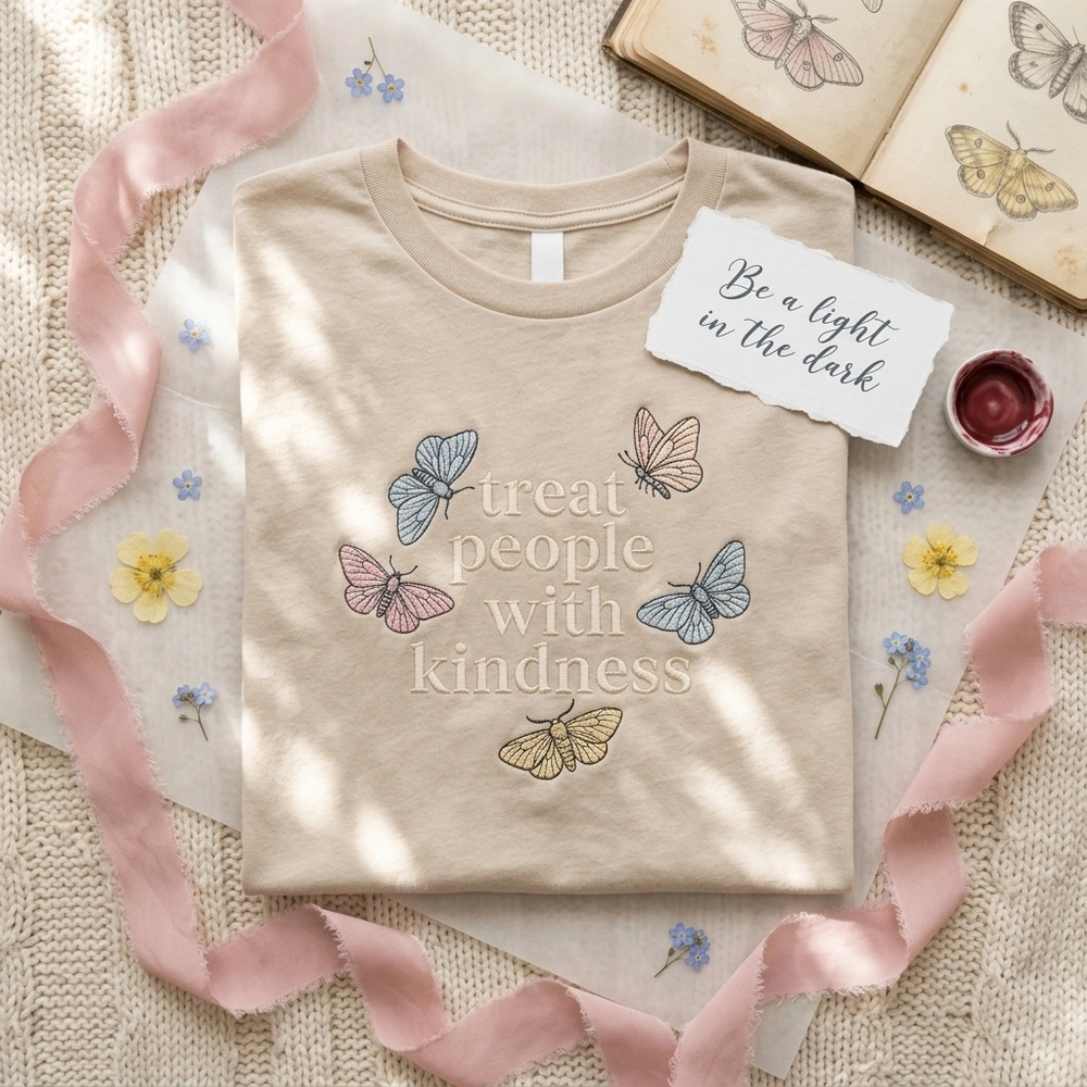 This design features a substantial 18cm x 12cm centered composition. The focal point is the phrase ‘treat people with kindness’ rendered in a clean, lowercase serif font using a dense cream-colored satin stitch. Surrounding the text are five meticulously detailed moths, each positioned at different angles to create organic movement. We use a sophisticated mix of embroidery techniques: pastel wing patterns in light blue, soft pink, and pale yellow form the base, while delicate running stitches define the intricate veins and antennae. The high-contrast cream thread against the rich chocolate brown fabric ensures the positive message remains highly legible while maintaining a soft, whimsical aesthetic.