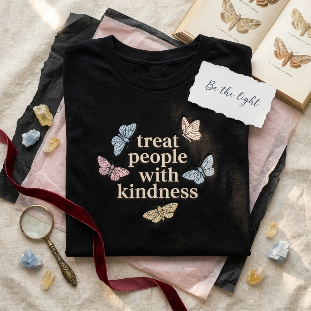 This design is inspired by a popular song and positive movement that encourages universal kindness. It pairs this uplifting message with a cottagecore moth aesthetic to create a unique piece of wearable art for fans of uplifting music.