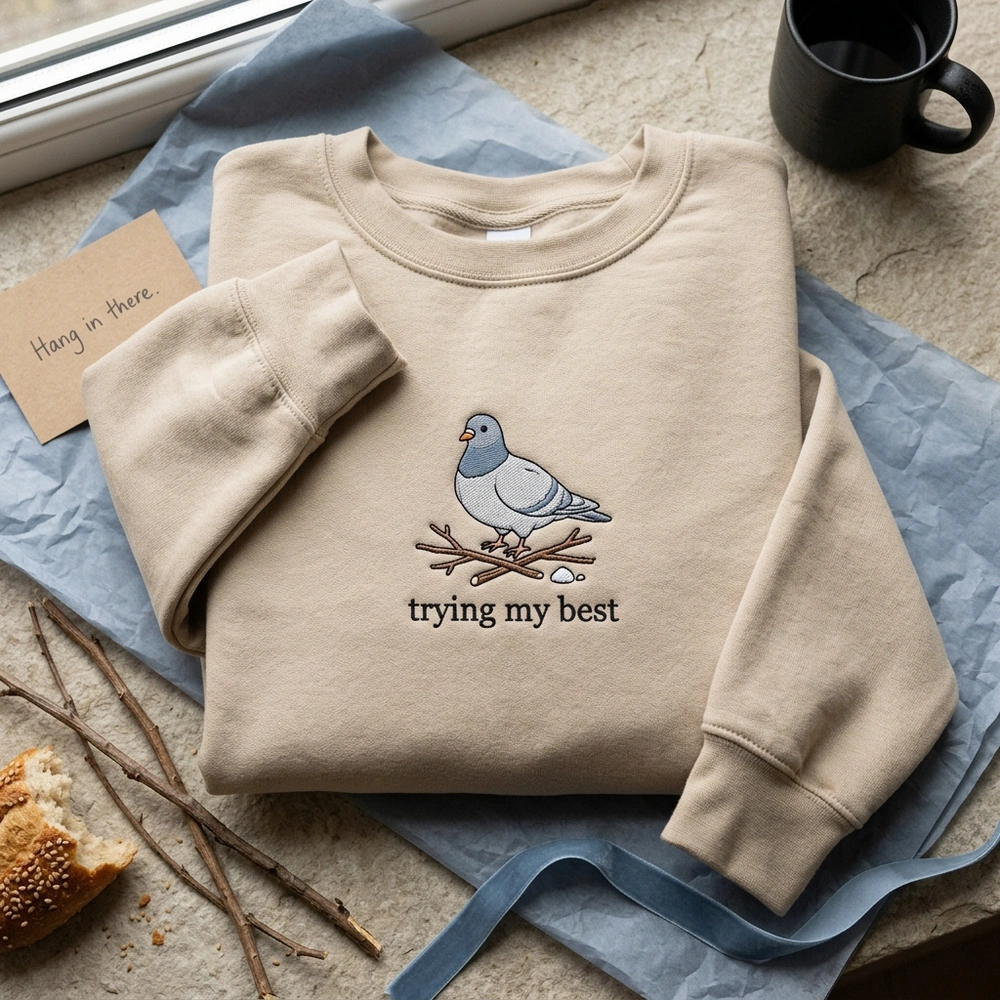 This relatable humor gift celebrates the small victories in life, inspired by the internet’s favorite “bad” nest builder. Whether you’re navigating a tough week or just love urban wildlife, this high-quality garment brings a smile to everyone who sees it. It captures that specific feeling of doing your absolute best with limited resources, making it a staple for Gen Z and Millennials alike. Browse more embroidered sweatshirts | funny sweatshirt in our collection to find your next favorite piece.