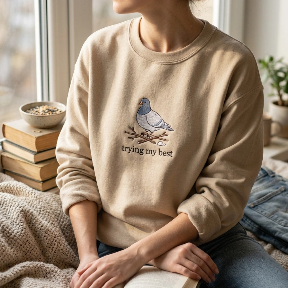 The Pigeon Embroidered Sweatshirt features the viral pigeon nest meme with “trying my best” text, making it the perfect funny bird gift for any fan.