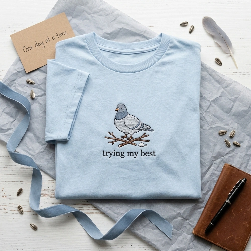 Our minimalist “Trying My Best” design is meticulously rendered with high-density machine embroidery to ensure a premium, textured finish. The derpy pigeon is brought to life with a plump light grey fill-stitch and a distinct iridescent purple-blue neck patch, while the symbolic “nest”—consisting of two crossed brown twigs and a single white pebble—is outlined in sharp black satin-stitch. This 10cm x 8cm embroidery sits perfectly on the center chest of our sand-colored garment, utilizing five specific thread colors for maximum detail and longevity.