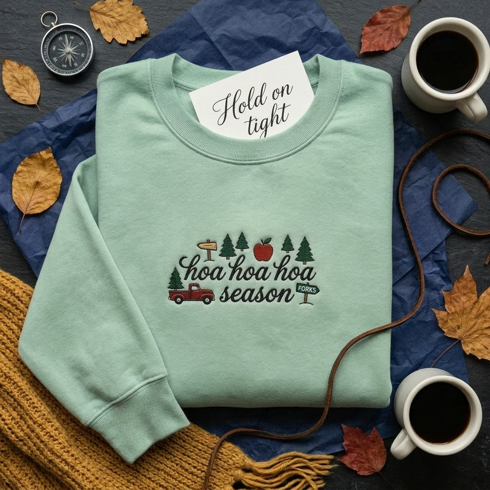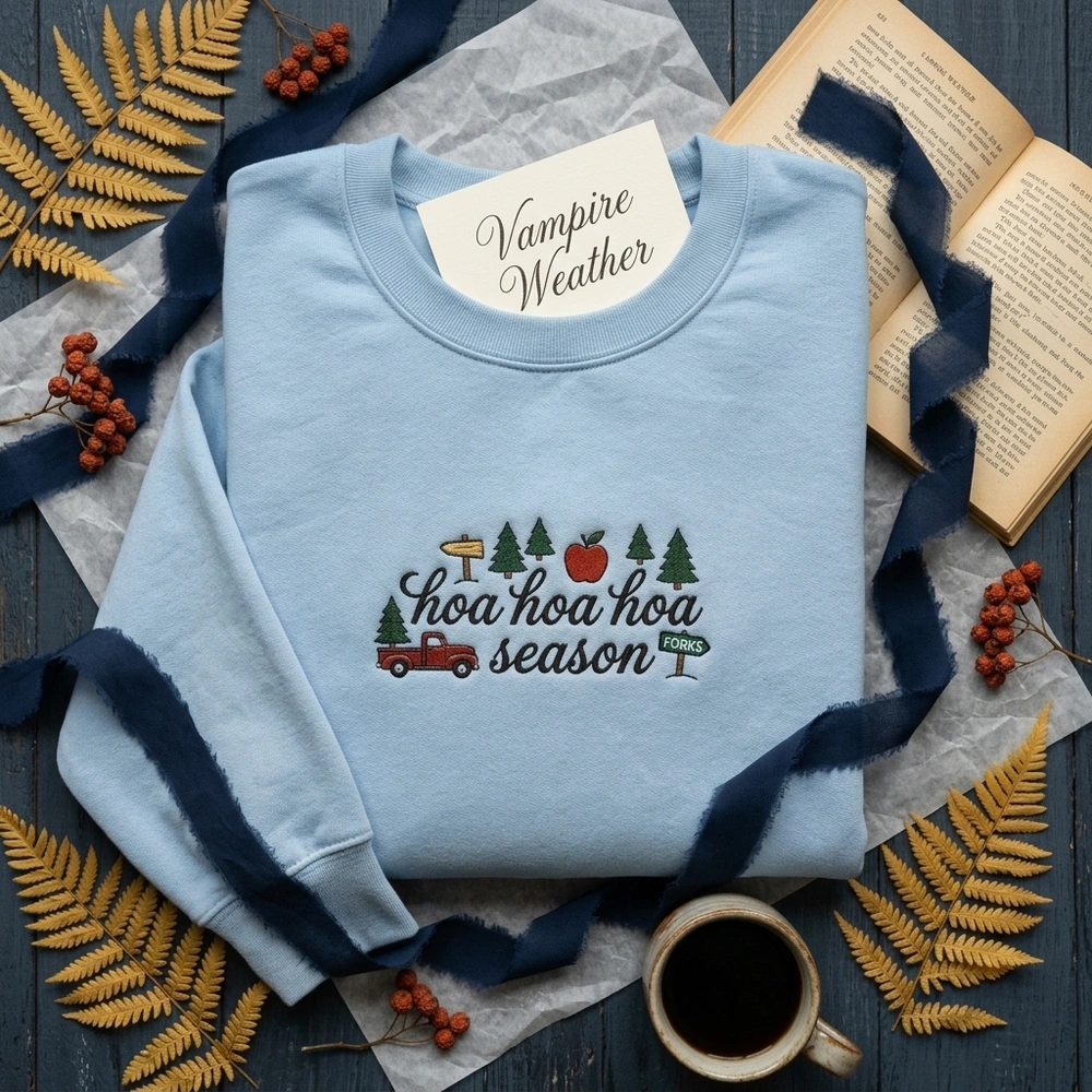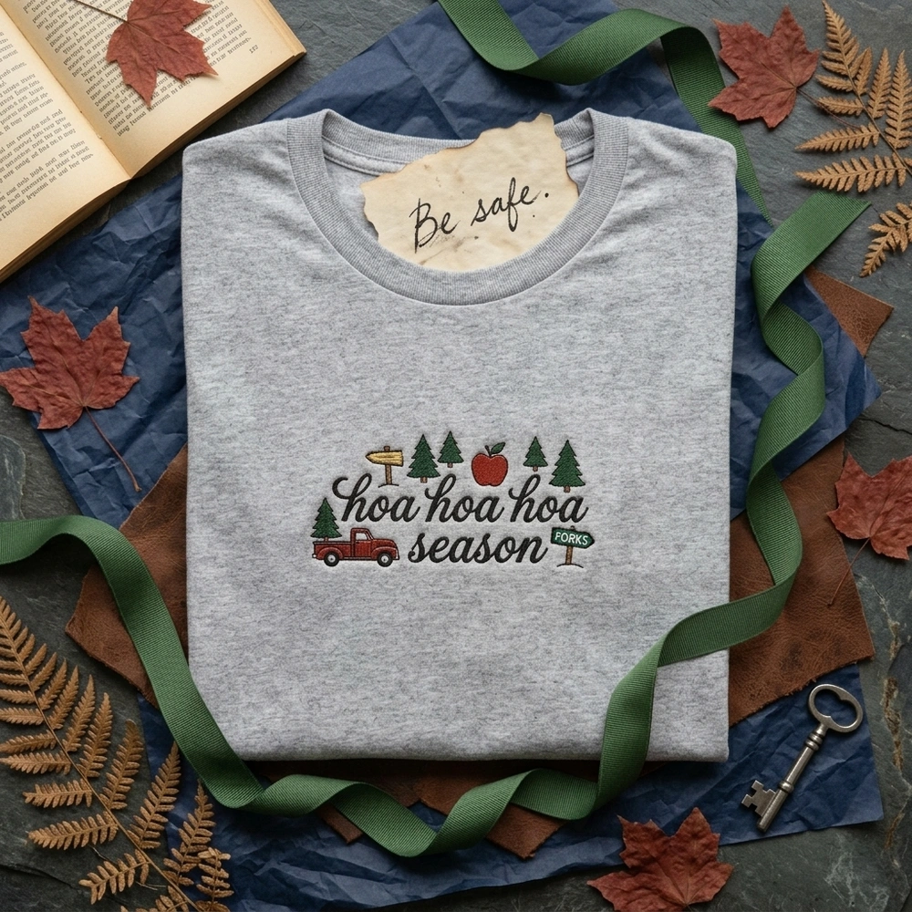 The Lollidollyart Twilight Forks Washington Embroidered Sweatshirt is a premium handcrafted crewneck featuring the iconic ‘hoa hoa hoa season’ design—perfect for personalized gifting.