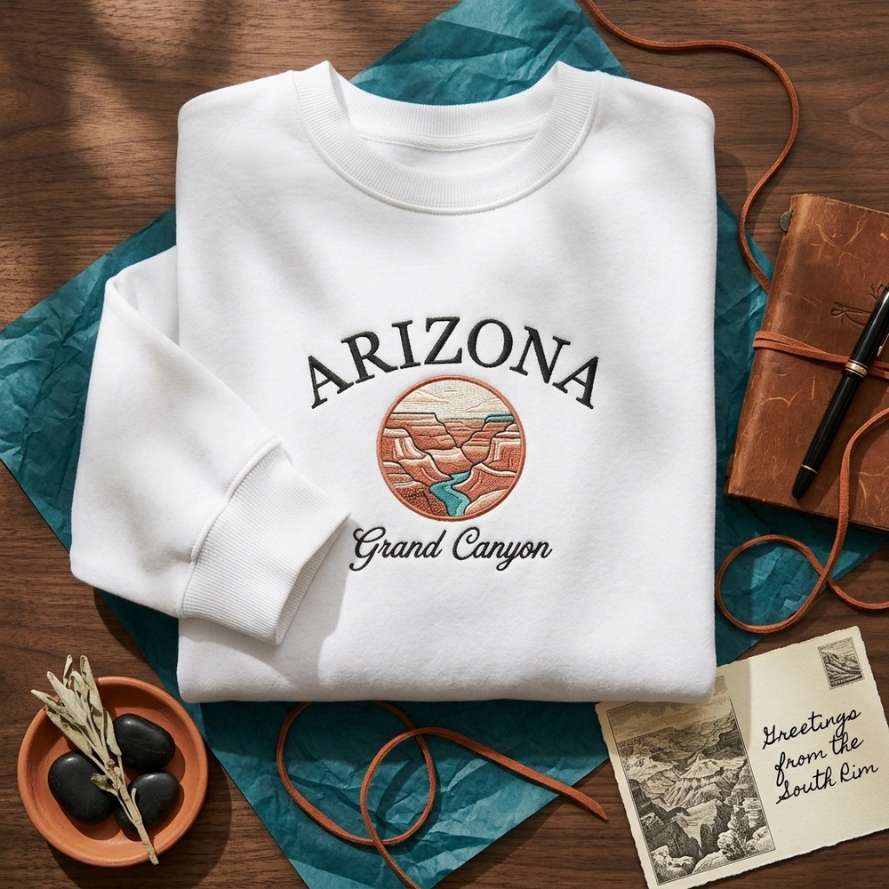 The Grand Canyon sweatshirt is a premium machine-embroidered top featuring a vintage Arizona landscape design—perfect for national park enthusiasts and hikers.