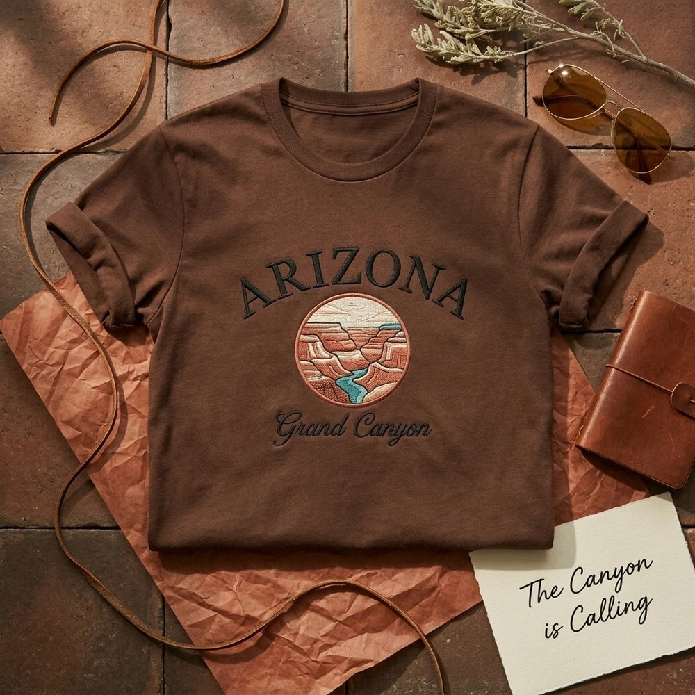 This original design is executed on a premium Sand-colored garment, providing a warm, neutral canvas for the vibrant 6-color palette. The composition features a classic collegiate-style arched “ARIZONA” in a bold black satin stitch for a textured, high-end feel. Centered beneath is a 15cm x 12cm circular emblem depicting the canyon walls in terracotta and rust tones, accented by a soft cream sun and a teal running stitch representing the Colorado River. The entire graphic is enclosed in a dark brown satin border and finished with “Grand Canyon” in a fluid, black script font. Every piece is machine-embroidered with high-density stitching to ensure the design remains crisp through years of wear.