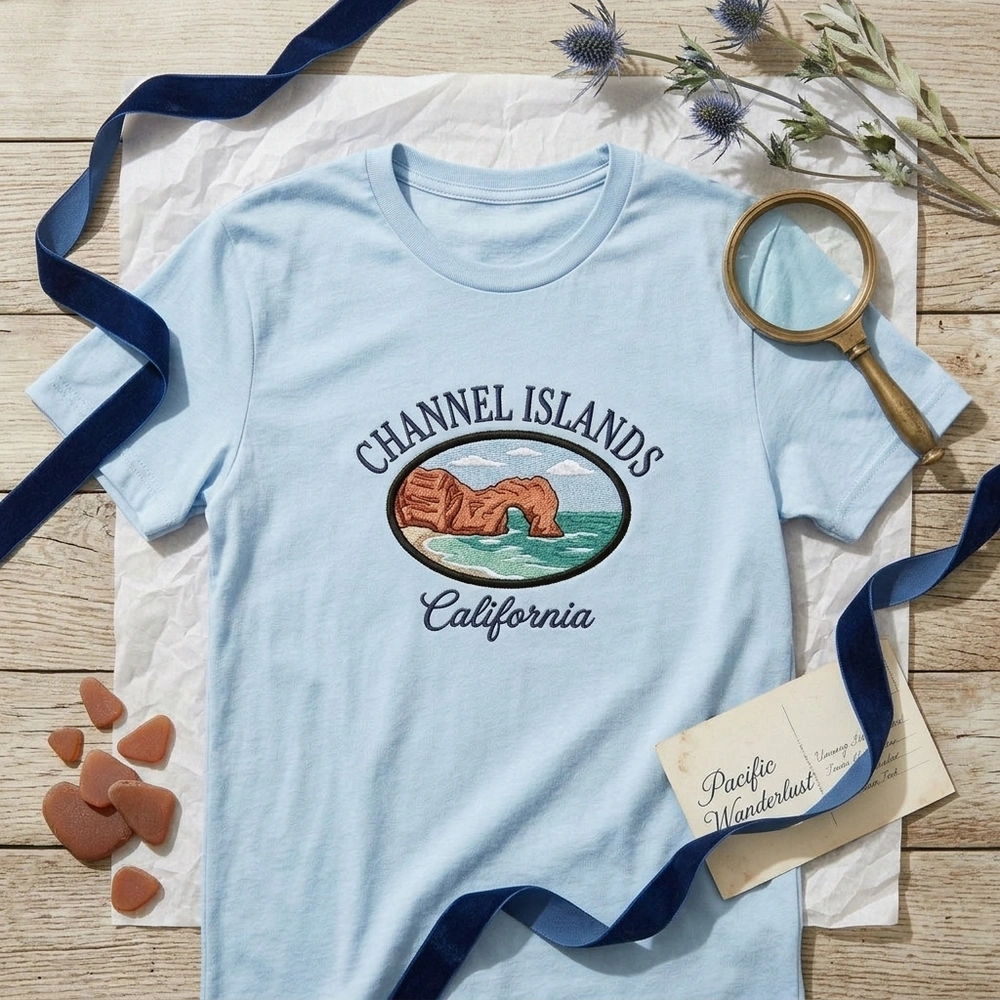 This intricate design captures the iconic Anacapa Island arch using approximately seven distinct thread colors for a rich, dimensional finish. The words “CHANNEL ISLANDS” are arched across the top in a dense navy blue satin stitch with a light blue outline. The central oval vignette features a terracotta and brown rock formation rendered in textured fill stitches to mimic natural stone. The surrounding Pacific waters are brought to life with teal and seafoam green tatami stitches, while the sky utilizes a horizontal fill for a breezy, coastal atmosphere. The word “California” is elegantly finished in a flowing navy script at the base. The design measures 12cm x 8cm and is perfectly centered on the chest.