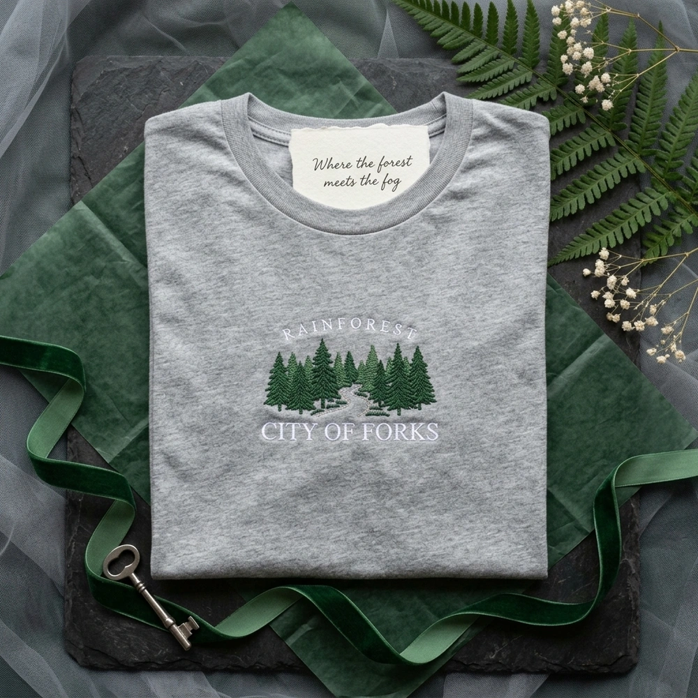 This design is inspired by the real city of Forks, Washington, which serves as the iconic setting for the Twilight saga. It captures the rainy, evergreen atmosphere of the Olympic National Park while using the city’s actual founding date of 1945 for an authentic vintage souvenir look.