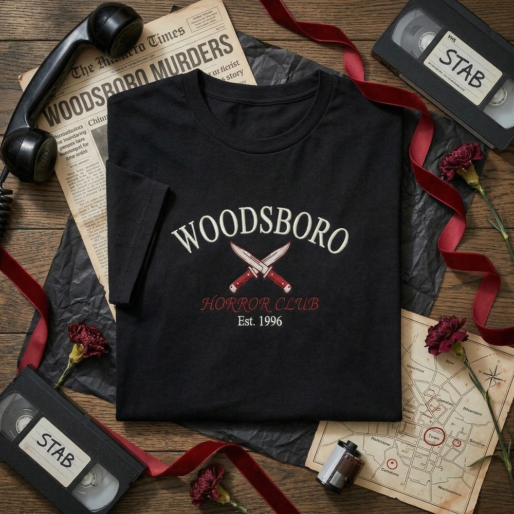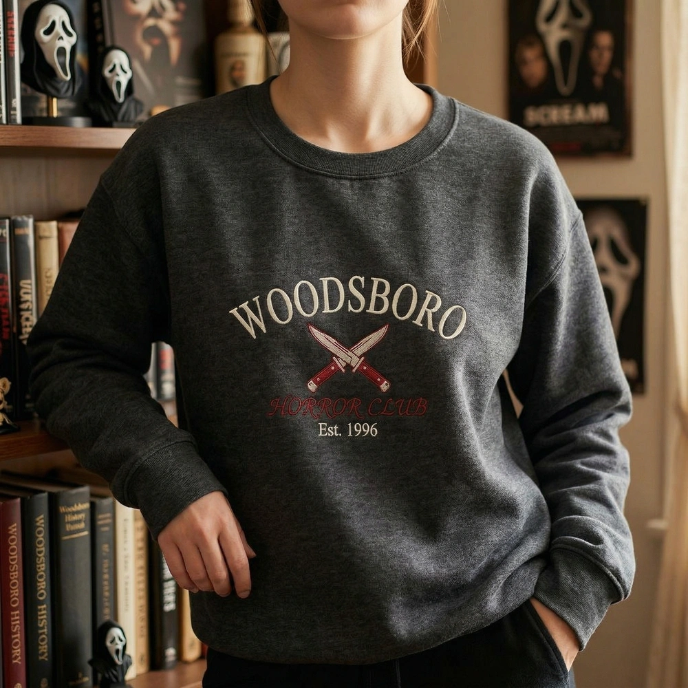 This design is expertly machine-embroidered on a high-quality Dark Heather garment, ensuring a durable and premium finish that outlasts standard prints. The embroidery measures a substantial 24cm x 15cm and features 2 distinct thread colors: #FFFFFF White for the bold athletic lettering and #8B0000 Blood Red for the striking crossed buck knives. The arched “WOODSBORO” text is perfectly balanced by the “HORROR CLUB” and “Est. 1996” details, creating a classic university look inspired by the ghostface lore.