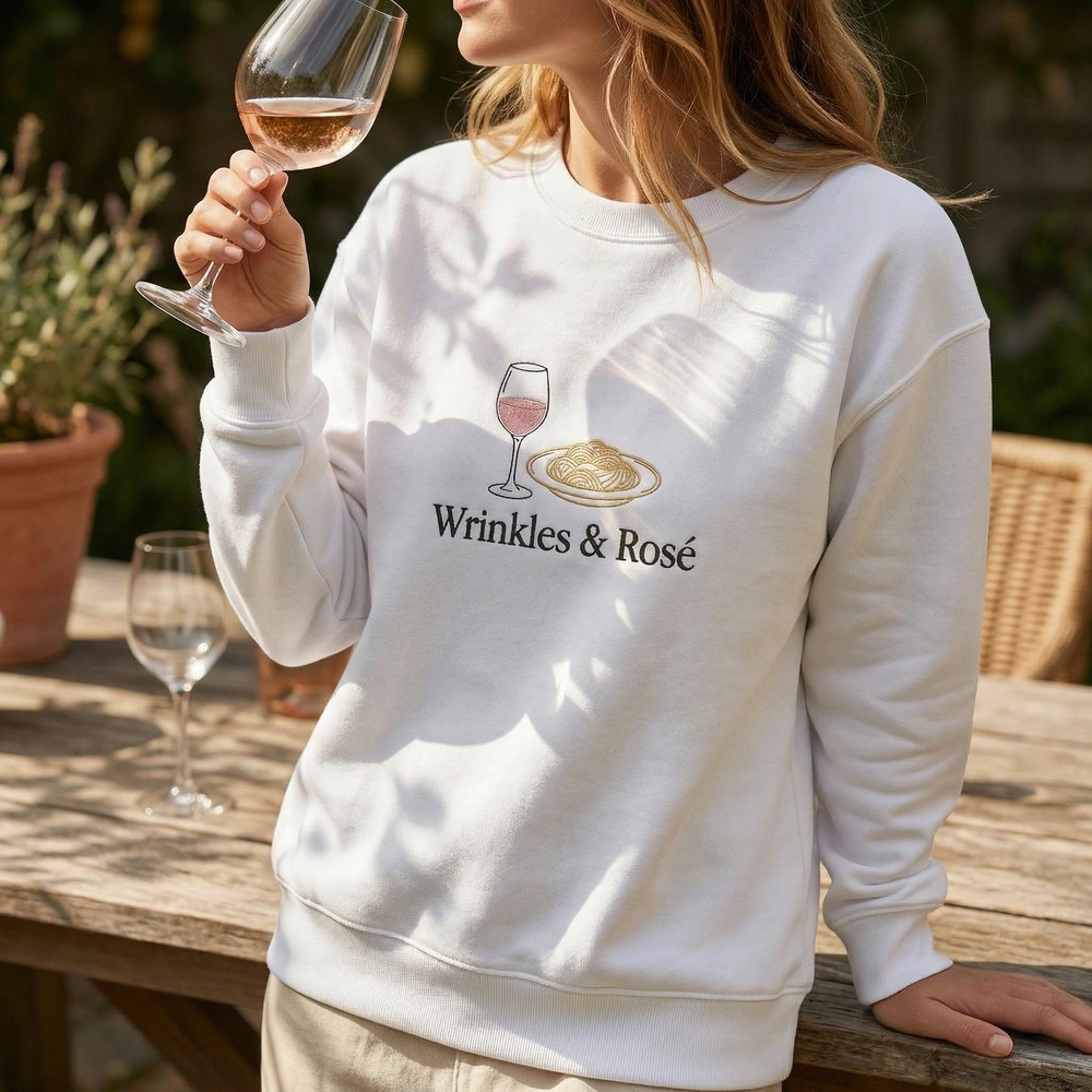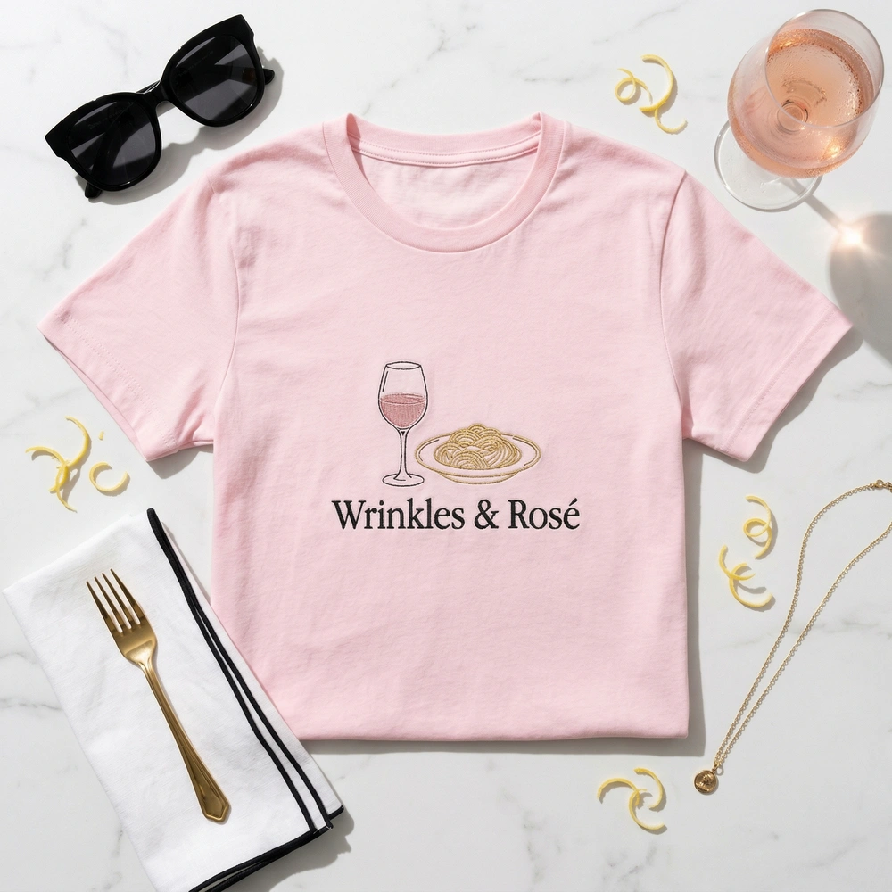 This original design features a high-end minimalist line-art illustration. It depicts a crystal wine glass filled with #E0A8B4 Rosé Pink thread and a delicate plate of pasta accented with #E5D08C Pasta Gold. The “Wrinkles & Rosé” text is stitched in a crisp #000000 Black classic serif font. The embroidery measures approximately 15cm x 12cm and is executed with precision using three premium thread colors on a premium white garment, ensuring a wealthy, clean aesthetic that lasts through every wash.
