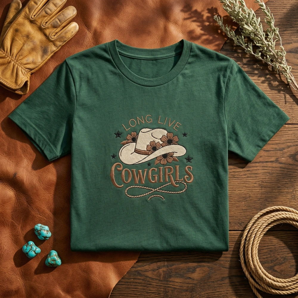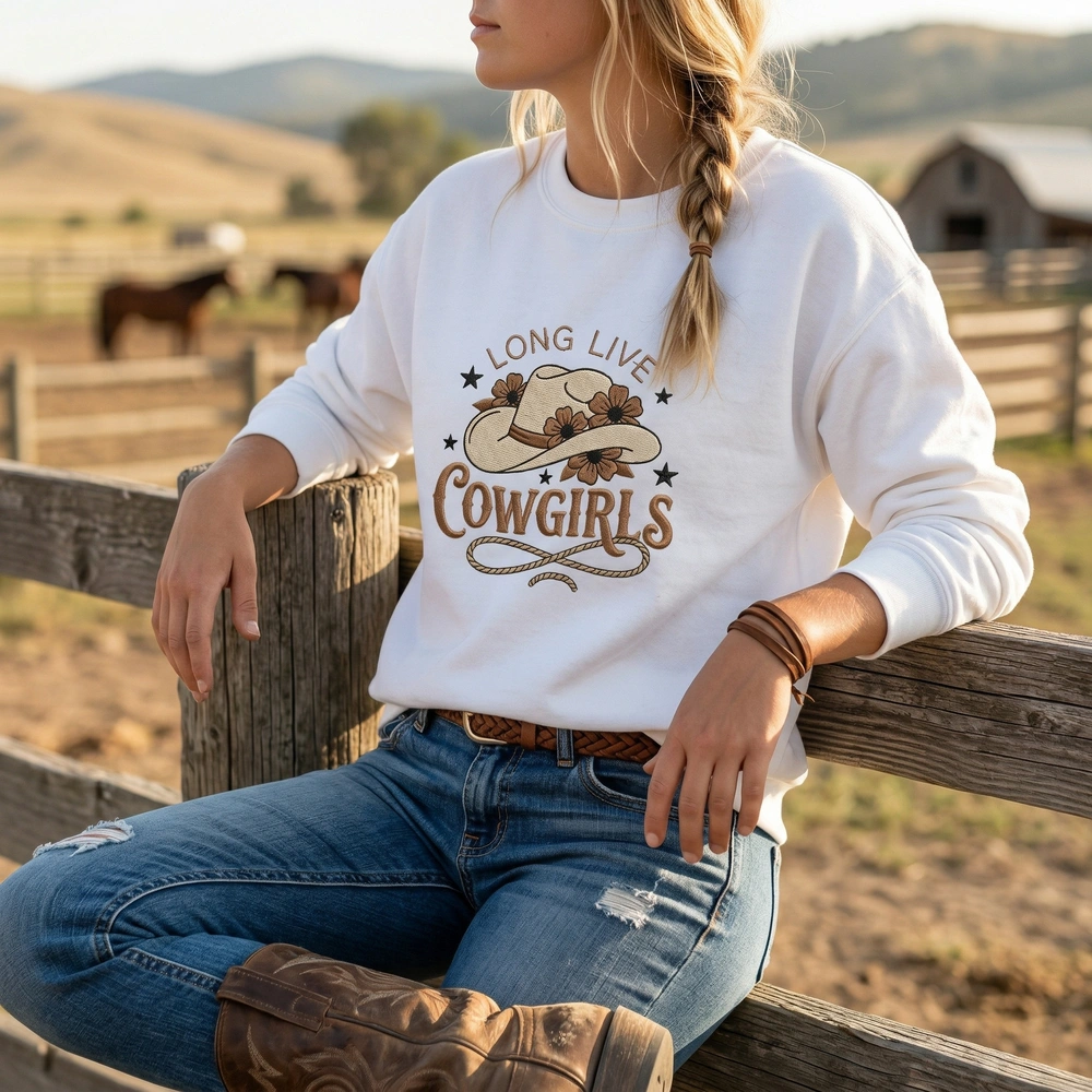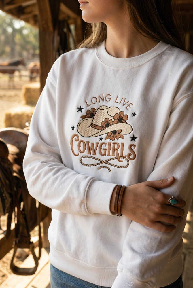 This exclusive Western sweatshirt features a large, 20cm x 18cm embroidered composition. The design showcases a stylized cowboy hat in a creamy tan shade (#D2B48C), decorated with chocolate brown five-petal flowers. Below the hat, the phrase “LONG LIVE COWGIRLS” is rendered in a chunky, rustic brown font. A looping lasso rope, embroidered with a textured stem stitch to mimic real cordage, sweeps across the bottom, accented by sharp black stars. We use premium satin stitches for the lettering and stars to ensure a high-shine, durable finish on our Sand, Ash, and White garment options.