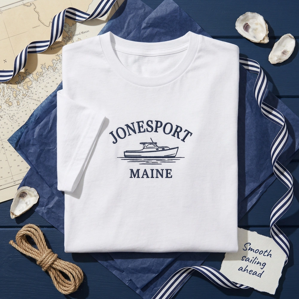 This original design is inspired by the coastal town of Jonesport, Maine, and the nostalgic aesthetic of 1990s nautical resort wear. It celebrates the authentic maritime culture of the New England coast.