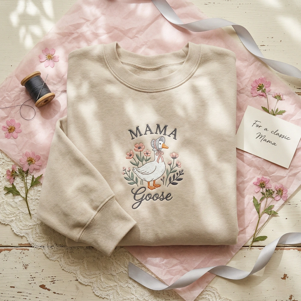 The Mama Goose Embroidered Sweatshirt is a premium machine-embroidered garment featuring a whimsical storybook goose—the ultimate cottagecore mom gift.