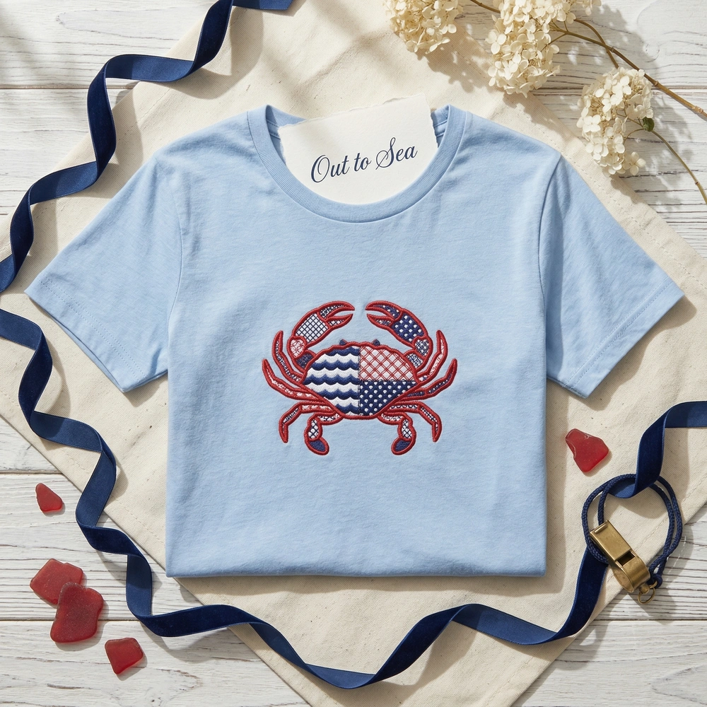 This design is inspired by traditional coastal quilting. We wanted to combine the nostalgic feel of a handmade quilt with modern machine embroidery techniques to create a “blue crab art” piece you can actually wear.