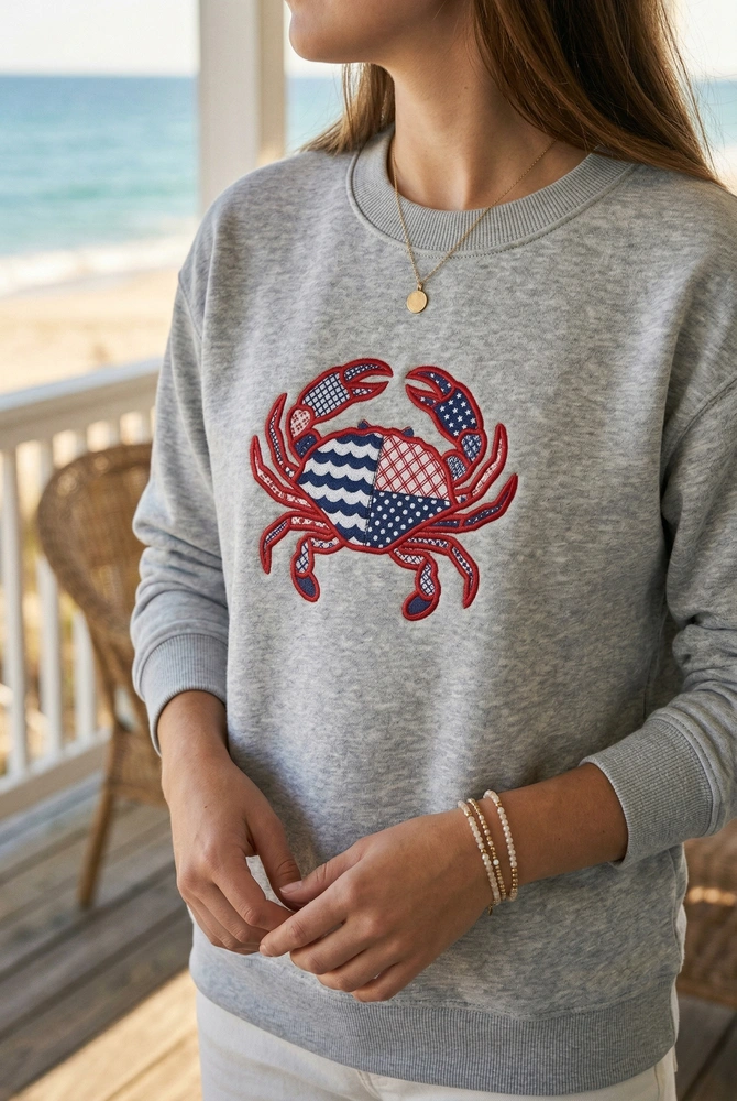 The Maryland crab sweatshirt is a premium machine-embroidered top featuring a stunning nautical patchwork design—the ultimate coastal grandmother aesthetic staple.