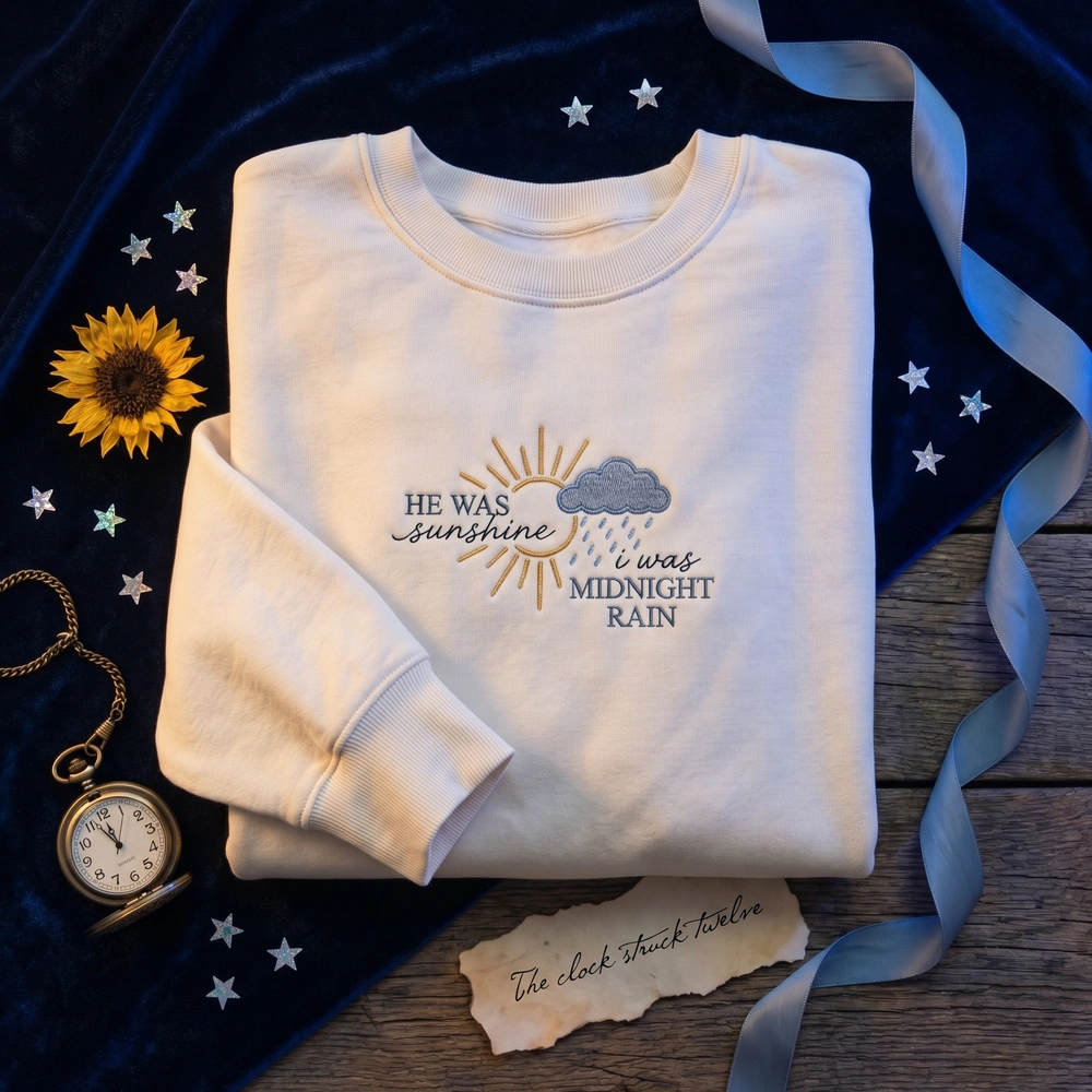 This design captures the poignant contrast of a “sunshine” personality versus a “midnight rain” soul, making it a must-have for fans of poetic storytelling and moody, aesthetic apparel. Whether you are heading to a local show or just lounging at home, this piece allows you to express your love for your favorite track in a subtle, sophisticated way. Browse more embroidered sweatshirts in our collection to find your next favorite look.