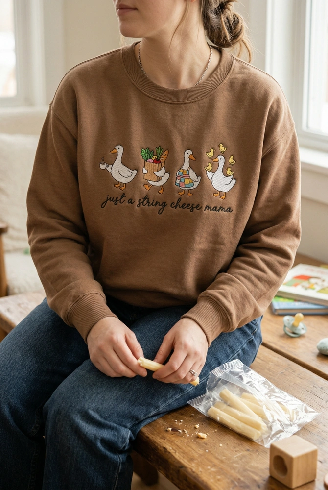 The Mom Life Sweatshirt features a funny string cheese mama duck design, capturing the chaotic reality of motherhood with premium machine embroidery.