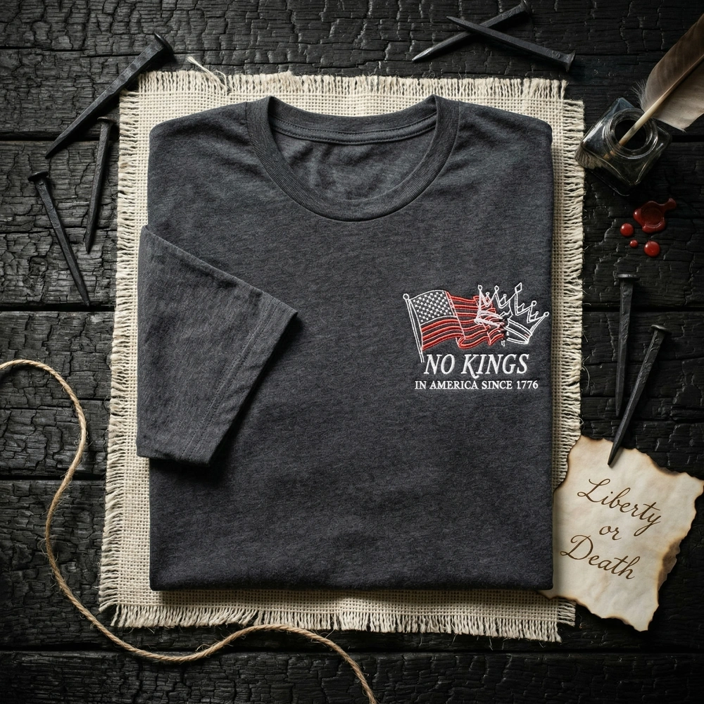 This high-density embroidery is expertly rendered on a premium Navy garment. The design measures 12cm x 8cm and is positioned on the left chest for a classic streetwear aesthetic. We use two specific thread colors: #FFFFFF White for the sketchy, hand-drawn flag lines and #CC0000 Protest Red for the aggressive “NO KINGS” stencil text. The contrast between the chaotic, hand-drawn stripes and the orderly, vintage typewriter font of the “IN AMERICA SINCE 1776” subtext creates a sophisticated typographic balance that is rare in political apparel.