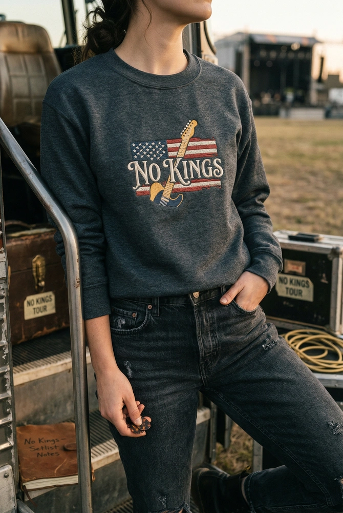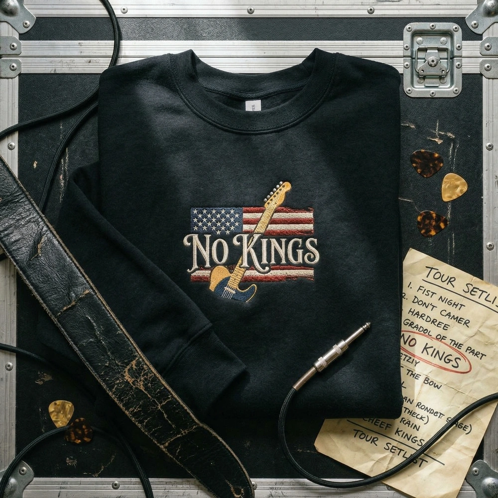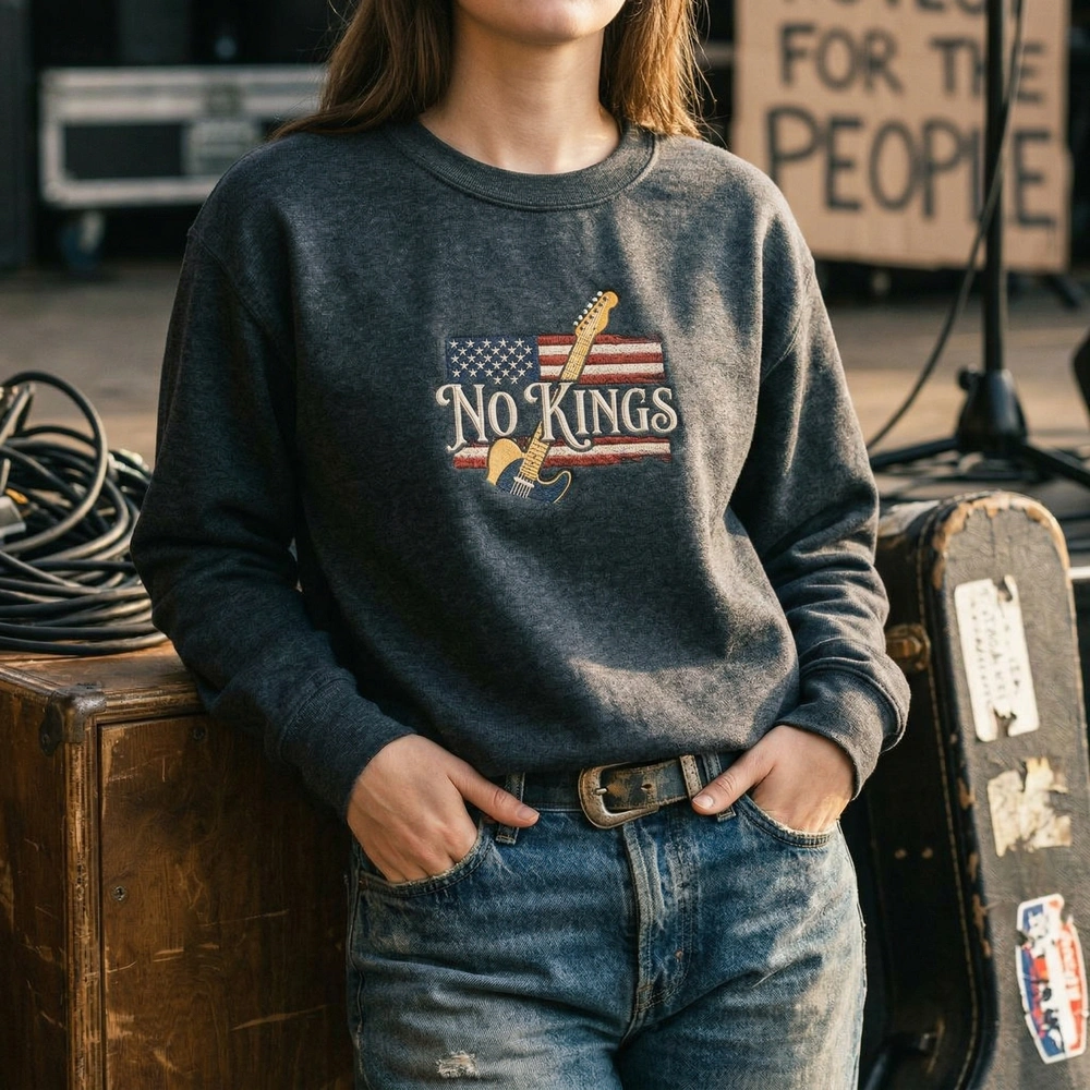 The No Kings Embroidered Sweatshirt features a vintage rock Telecaster design, blending gritty Americana protest vibes with premium machine embroidery.