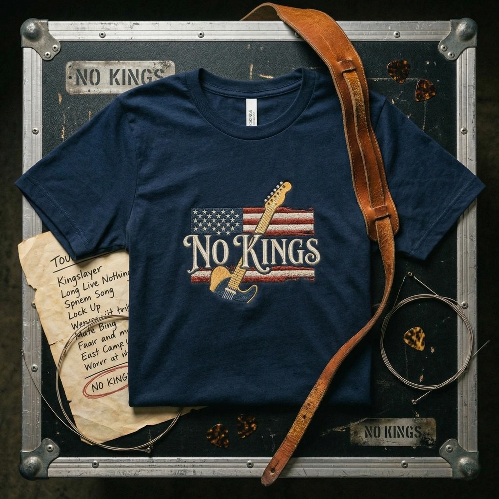 This design is expertly crafted on a Dark Heather garment, providing a moody, charcoal-adjacent backdrop that makes the embroidery pop. The centerpiece is a 22cm x 16cm embroidery featuring massive, distressed stencil letters spelling “NO KINGS.” A classic butterscotch Fender Telecaster-style guitar neck leans against the typography, set against a muted, frayed American flag background. We use four specific matte thread colors—Butterscotch Blonde, Faded Red, Muted Navy, and Vintage White—to ensure a vintage, non-shiny texture that looks like authentic tour merch from decades past.
