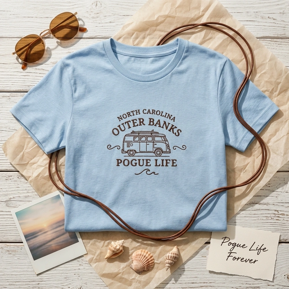 This design is inspired by the carefree lifestyle and coastal setting of a beloved show based on the islands of North Carolina. It captures the “Pogue” spirit and vintage surf culture through subtle, boutique-style embroidery.