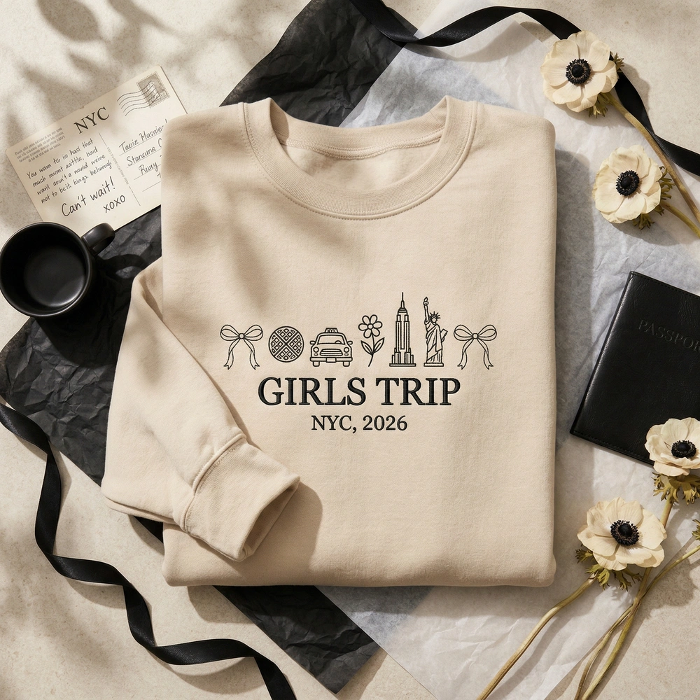 This exclusive design is meticulously embroidered on a high-quality Sand-colored garment, providing a warm, neutral base for the bold black threadwork. The center-chest composition (20cm x 12cm) features a horizontal row of minimalist line-art icons, including coquette bows, a grid-patterned waffle, a classic NYC taxi, a shadow monster silhouette, the Empire State Building, and the Statue of Liberty. The heavy serif typography used for “GIRLS TRIP” and “NYC, 2026” utilizes a dense satin stitch for a high-end, textured feel that lasts through every wash.